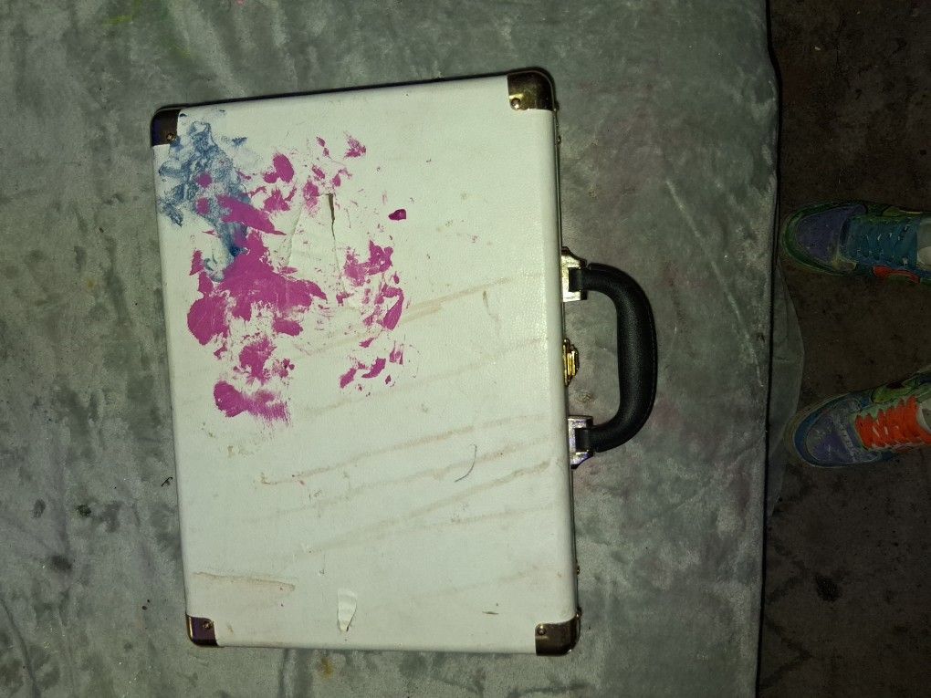 Portable Victrola record player. This turntable has Bluetooth, line in, and phono options. Plays 33, 45, and 78 RPM records. Has a headphone jack. Exterior has some paint marks and scuffs from use.