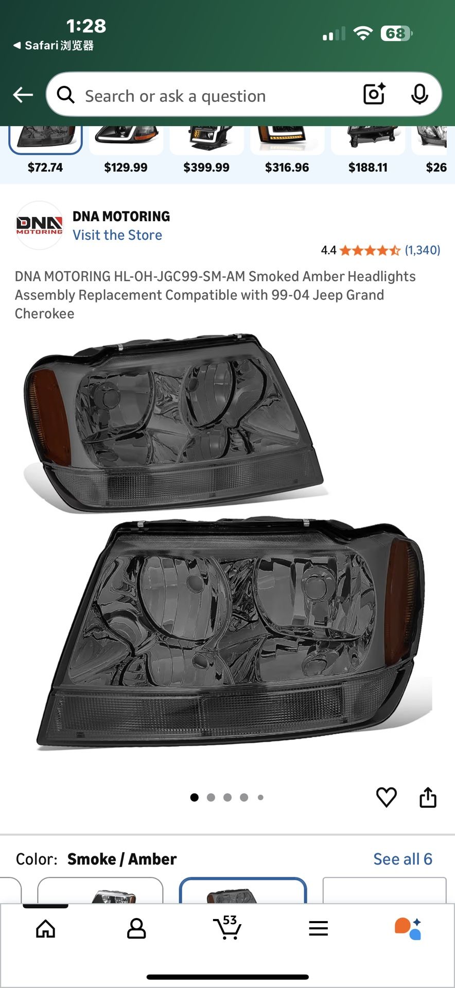 New in box DNA MOTORING HL-OH-JGC99-SM-AM Smoked Amber Headlights Assembly Replacement Compatible with 99-04 Jeep Grand Cherokee
