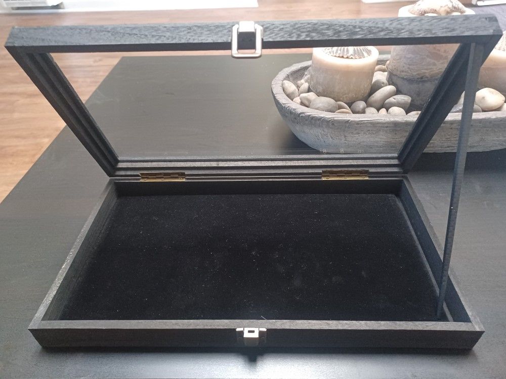 Jewelry display showcase. Black with glass top. Latch lock with velvet interior pad. Display case for personal or resell vendors. Measurements: 15" long x 8 1/2" roughly over an inch deep inside. Excellent new condition. Please message to schedule Pickup day and time. Huntington Beach. Thank you