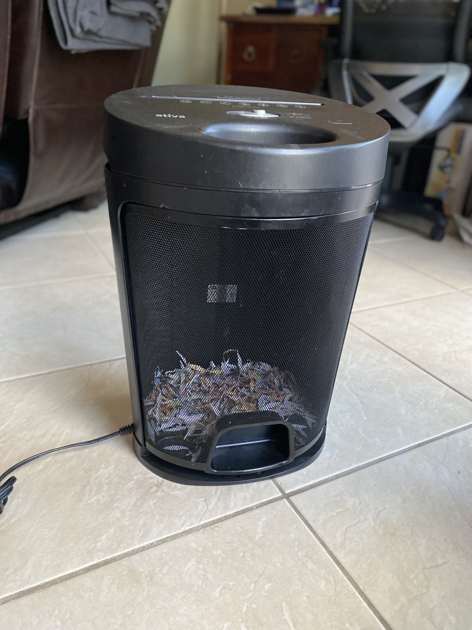 Number Of Sheets Per Pass 12 Cut Style Diamond Waste Receptacle Capacity 4.5 gallons Accepts Paper Clips/Staples credit cards; staples Maximum Shred Speed 5.58 fpm Integrated Waste Receptacle Yes Shred Size 0.28" x 2.09" Throat Width 9 inches Manual Reverse Yes Overload Protection Yes Automatic Start/Stop Yes Full-Bag Indicator no Height 20.5 inches Width 14.44 inches Depth 11.44 inches