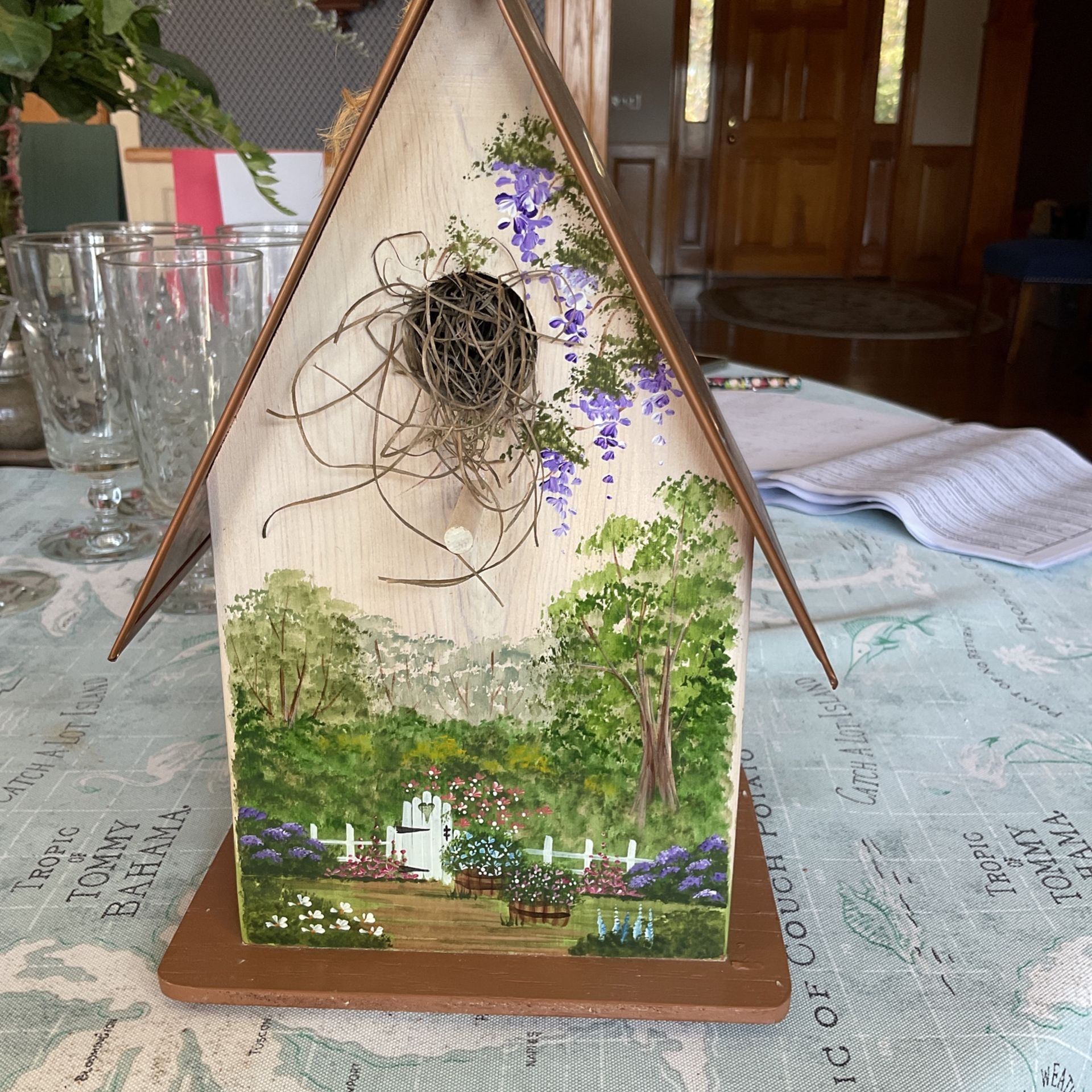 Beautiful copper roof and hand painted birdhouse Never used 11 x 7 x 6”