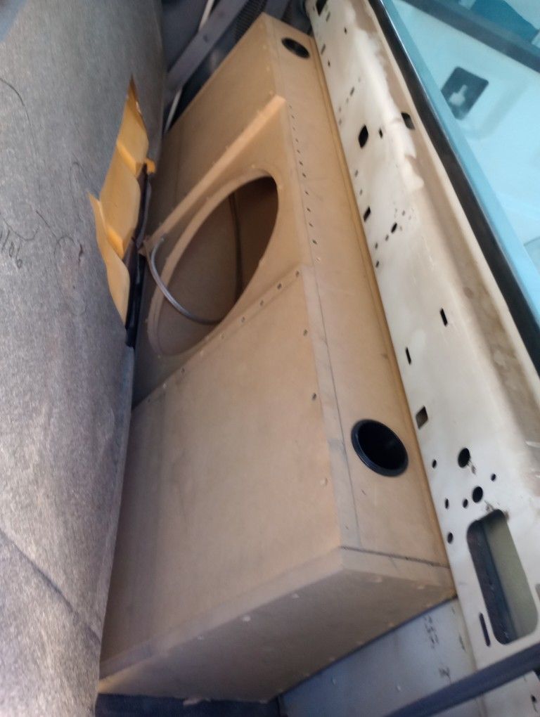 Extreme custom speaker box for 1999 to 2003 Ford super duty single cab bench seat with seat position all the way back. Fits one 15 in subwoofer. 7.75 in maximum mounting depth currently. Main mounting plate is recessed 5/8 of an inch to reduce contact with seat back. Circle is cut out in the back to allowe magnet to protrude slightly outside of box. This was done to allow installation of larger subwoofers. You can modify to your taste. Box also has ports on the top facing up. Can be easily modified for 12-in 10-in or 8-in with removal of center plate. Utilizes maximum amount of space. Modification of rear interior panel required. Which consists of cutting and removing bottom 80%. Box was designed to sit flat against steel body.