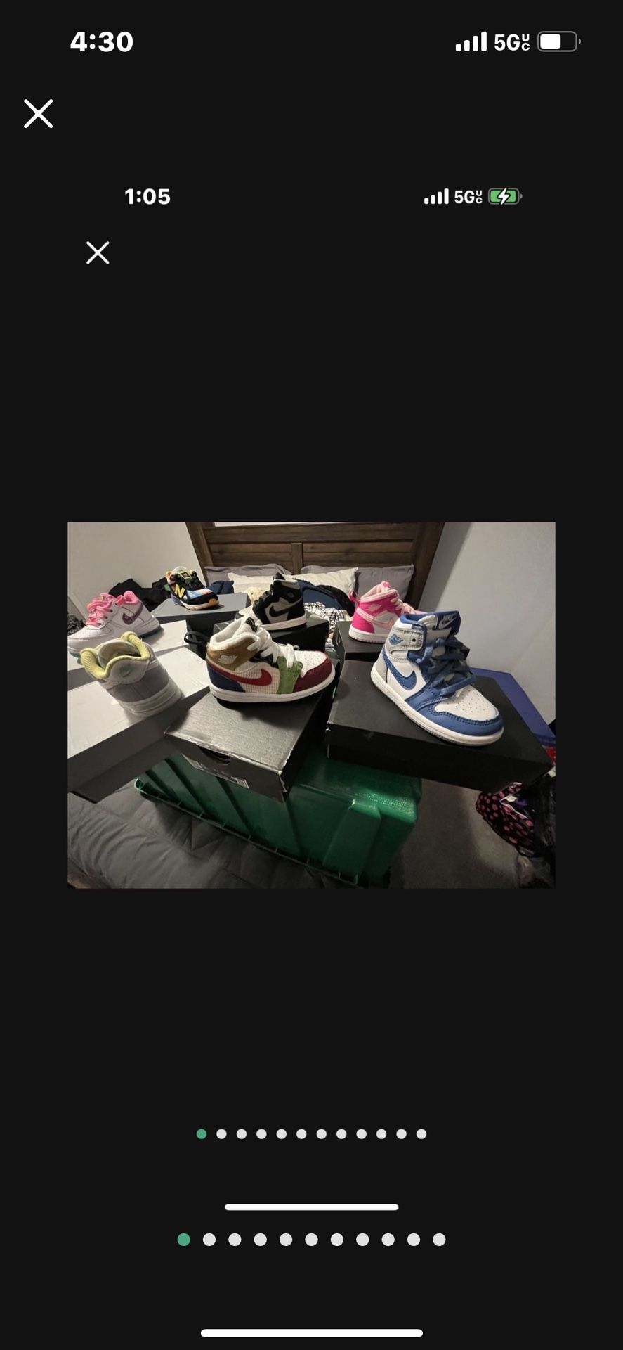 Page 1-6 size 6c (Page 7, 8, &9th page are size 5c) Page 10,11, 12, JORDAN’S!!! NIKES, New Balances, etc Some worn, one time!! All Size 6c with box We have 7c on the last 3 pages with box Some are👇🏽 Some are 2 PAIRS!! For $100.00 3 pairs for $140.00 It depends on which ones!! Some 5 pairs for $240.00 your picks