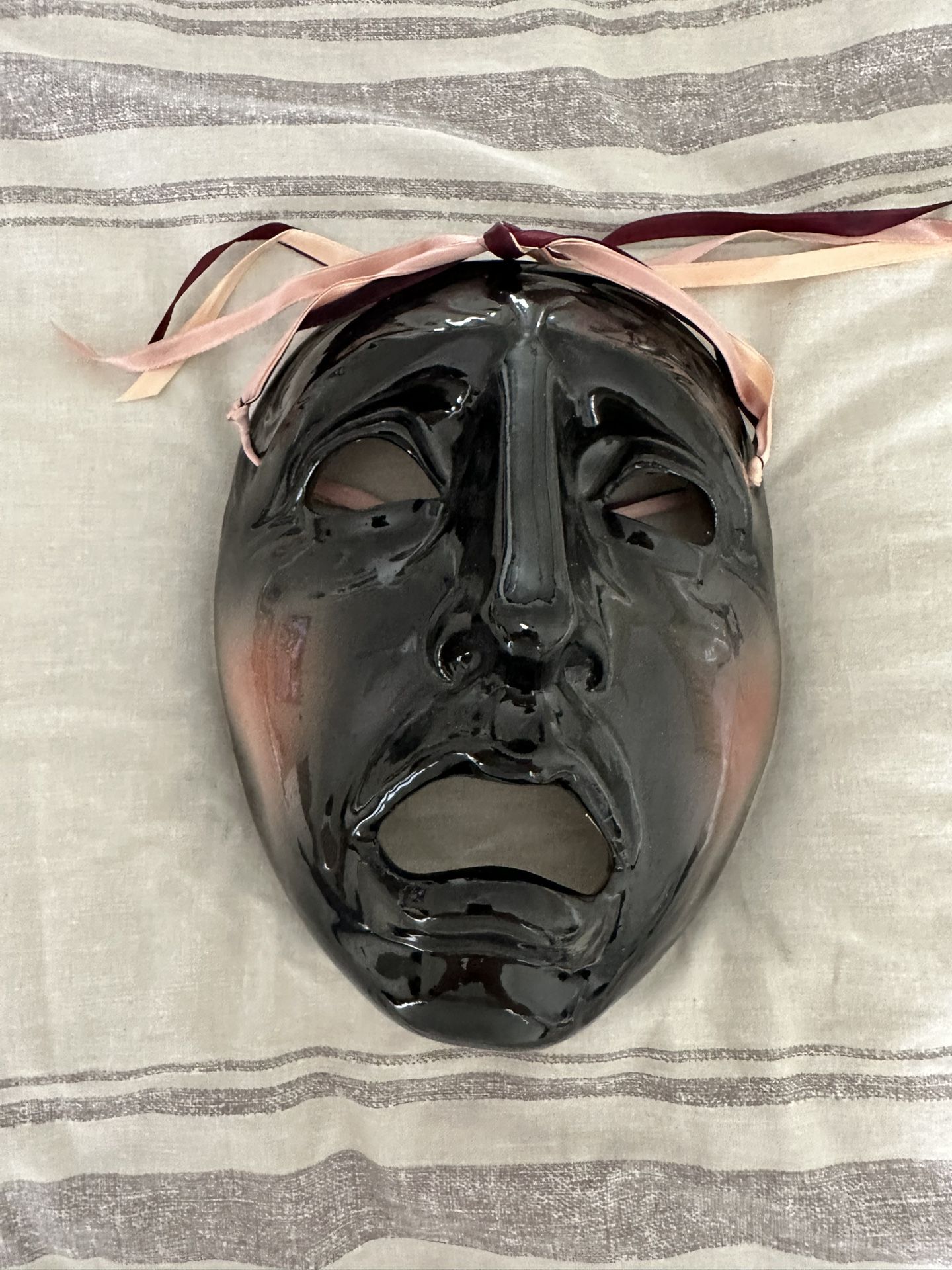 About Face Clay Art wall mask. Black Decorative ceramic mask with ribbons. This vintage wall mask from Clay Art of San Francisco is a unique addition to any home decor.