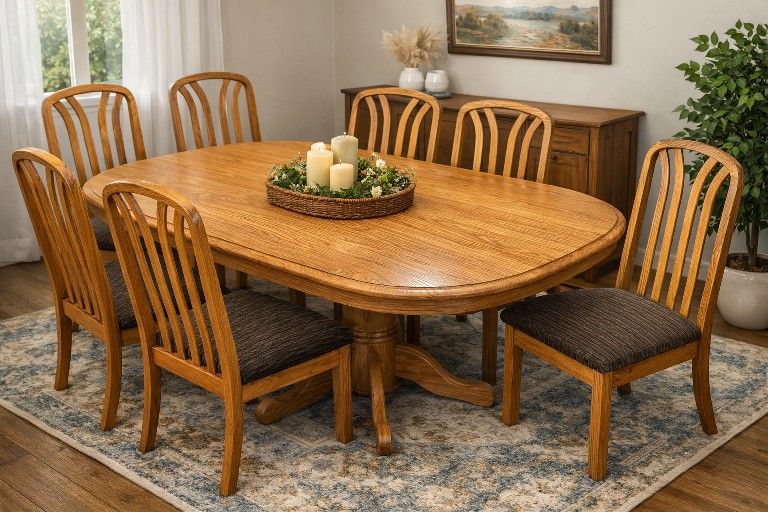 Solid Oak Dining Table w/ 2 Leaves + 7 Chairs