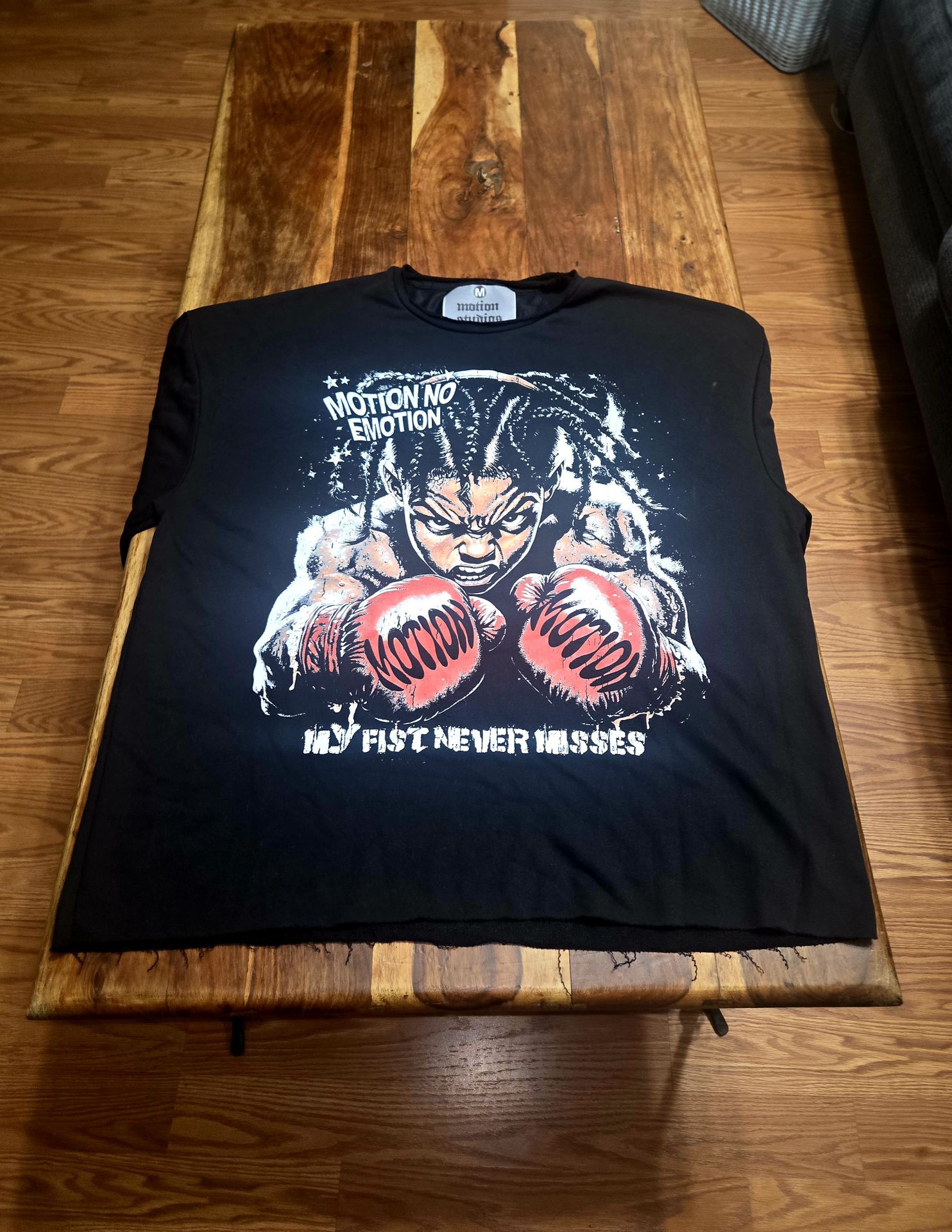Motion Studios Men's Boxer Graphic T-Shirt. This stylish t-shirt features a bold eye-catching design. Perfect for everyday wear. Size Medium slightly over-sized with a fringed collar and bottom hem. Brand New/Never Worn!