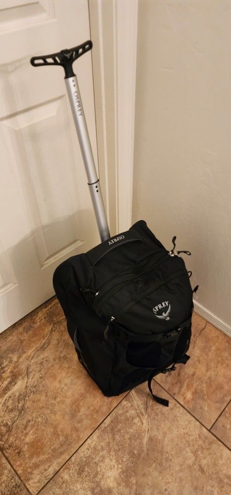 Description: Up for sale is my lightly used Osprey Farpoint 36 Wheeled Travel Pack (36 L). Capacity: approx. 36 liters (ideal for carry-on or extended weekend travel) Model: Wheeled version — combines backpack straps + built-in wheels & pull-handle for easy rolling Condition: Excellent — everything works perfectly (zippers, straps, wheels, handle). No major damage, no structural issues. Color: Black (as shown in photos) Usage: I’ve used it sparingly; the bag shows very light signs of use (minimal scuffs, clean interior). Features: Full-panel zip access, mesh organisation pockets, internal compression straps, backpack harness that tucks away. Why I’m selling: Downsizing my gear / no longer traveling with rolling bag. Highlights: Trusted brand: Osprey has a strong reputation for quality travel/backpack gear. Versatile travel bag: roll it through airports, then carry as a backpack when needed. Size: 36 L is a sweet spot for efficient travel without over-packing. Condition notes (please read): Wheels roll smoothly; no wobble or missing parts. Pull handle works and locks securely. Backpack straps & hip-belt function as intended. Interior is clean, straps and stitching intact. Exterior: very minor cosmetic wear (small scuffs on base/wheels) but nothing that affects function. New this model runs ~$300 USD. Since this bag is lightly used and in excellent condition, you’re getting first-rate quality at a fraction of the cost.