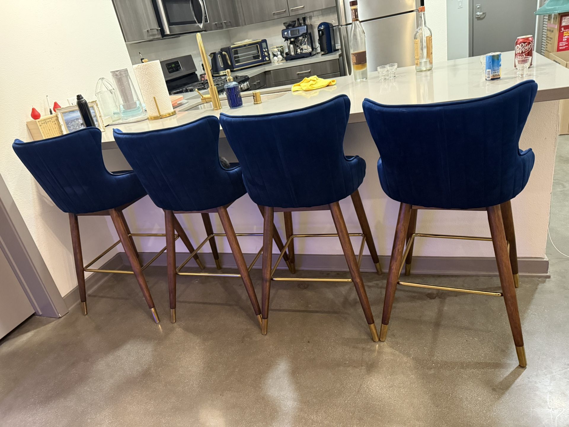 Comfortable kitchen bar stools Used for one year Blue velvet Overall: 40.2 inches H x 19.7 inches W x 20.5 inches D Seat: 28.3 inches H x 18.5 inches W x 15.4 inches D