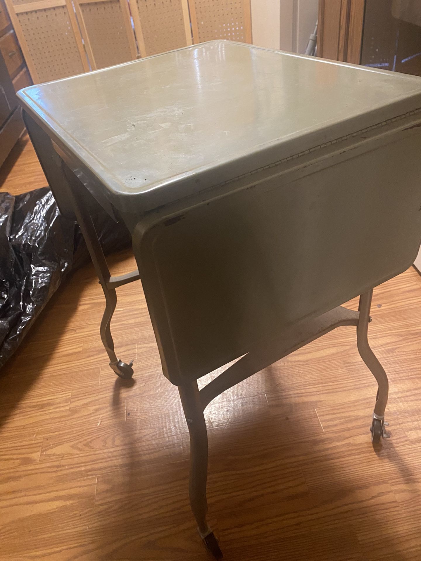 Green Metal Expanding Rolling Cart With Pullout Drawer. Minor rust spot where paint has peeled only. 25 OBO