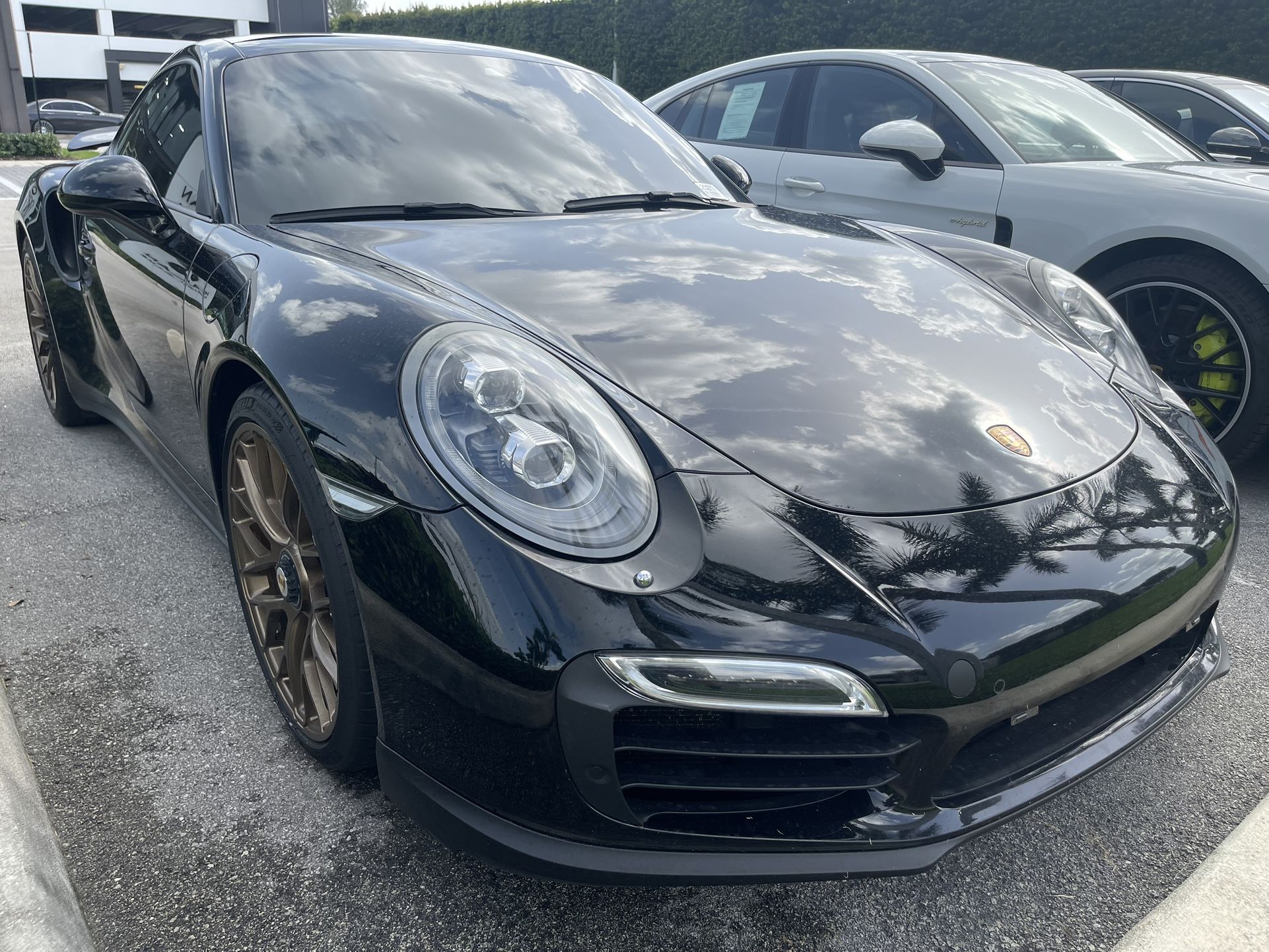 2014 Porsche 911 Turbo S Internet Price. $104,900 Down Payment. - $10,400 Amount Finance. $94,900 +++ Check Availability Call Now Porsche Window Sticker What's My Car Worth? powered by BASIC INFO EXTERIOR: Black DRIVETRAIN: AWD INTERIOR: Black TRANSMISSION: 7-Speed Porsche Doppelkupplung (PDK) ENGINE: 3.8L 6-Cylinder BiTurbo FUEL EFFICIENCY: 17 CITY / 24 HWY MILEAGE: 57,785 KEY FEATURES AWD FOG LIGHTS KEYLESS ENTRY LEATHER SEATS MEMORY SEATS NAVIGATION SYSTEM POWER SEATS RAIN SENSING WIPERS SCHEDULE TEST DRIVE CHECK AVAILABILITY HISTORY REPORT Show me the Carfax DESCRIPTION Black 2014 Porsche 911 Turbo S 3.8L 6-Cylinder BiTurbo AWD, ABS brakes, Alloy wheels, DVD-Audio, Electronic Stability Control, Front dual zone A/C, Heated door mirrors, Illuminated entry, Leather Seat Trim, Low tire pressure warning, Navigation System, Porsche Communication Management, Remote keyless entry, Traction control.