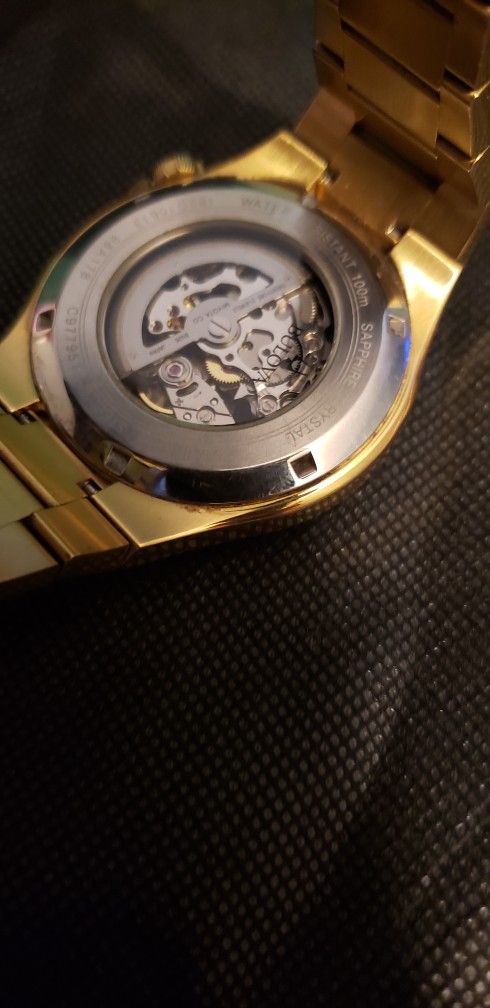 From the Classic Automatic Collection. New Sport style in two-tone gold and gunmetal IP stainless steel case, open aperture black dial with gold-tone accents and black inner dial ring, exhibition case back, skeleton automatic movement with 40-hour power reserve, sapphire glass, gold-tone stainless steel bracelet with double-press deployment closure, and resistance to 100 meters. This watch was worn for a wedding and 2 more events, there's no wear a or tear. A cleaning is all you would do if you think its necessary.