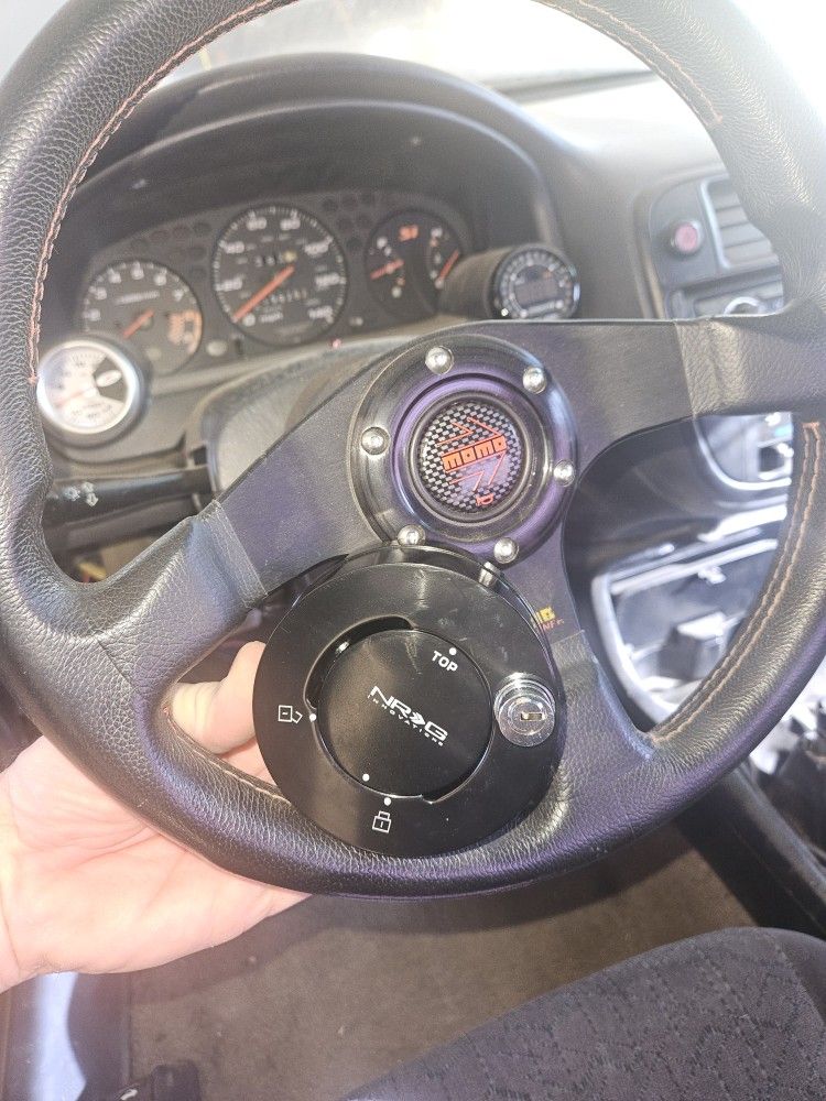 Detachable momo steering wheel with nrg lock and keys 300 without stock setup . si cluster 300 Innovate wideband complete just mocked up 250 Dual gauge cluster for 98 ek civic 50