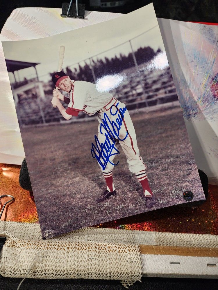 This is an autographed 8x10 glossy photo of Marty Marion in a St. Louis Cardinals uniform. The signature is in blue felt tip pen. It is a collectible item for baseball fans. The photo includes a Certificate of Authenticity (COA) Marty Marion was the National League MVP in 1944.