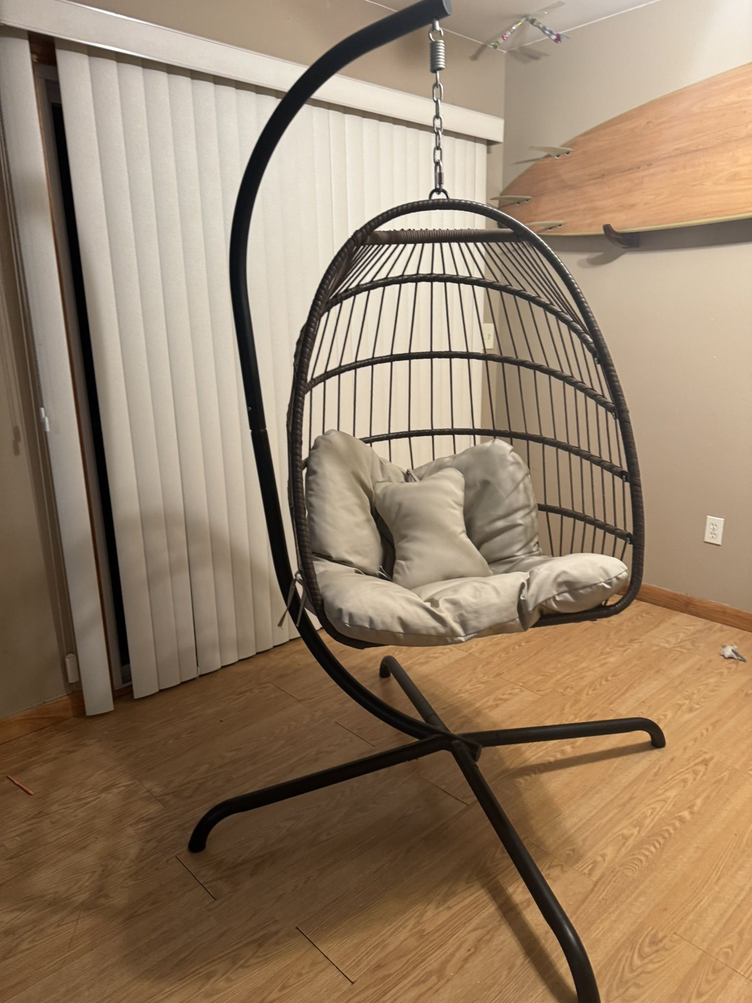 Relax in style with this cozy hanging egg chair! Perfect for indoors or outdoors, it comes with a sturdy metal stand and soft cushioned seat for ultimate comfort. ✅ Sturdy steel frame ✅ Comfortable beige cushions included ✅ Modern rattan-style design ✅ Great for reading, lounging, or adding a stylish touch to any space Condition: Gently used, excellent condition. Pick up only. 💲 110.00 Send me a message if interested!