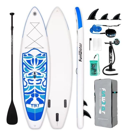 Brand new in box. Never opened. Planned to use but never got around to taking it out. 【New ultra light construction dual layer PVC 】35% lighter than comparable models. Inflated 10’6" long 33" wide 6" thick, weight 17.6 lbs, maximum capacity is up to 330 lbs, stable and great for all skill levels and conditions. 【Ultra durable】Constructed with additional PVC layer of board rails are highly strengthened the board durability. 【Safety & Convenience】 33'' board width and 3 removable fins construction achieved amazing balance ability. 【Package including 】 Board, adjustable aluminum paddle, high pressure pump, travel backpack, coil leash,waterproof bag, and 3 removable fins.
