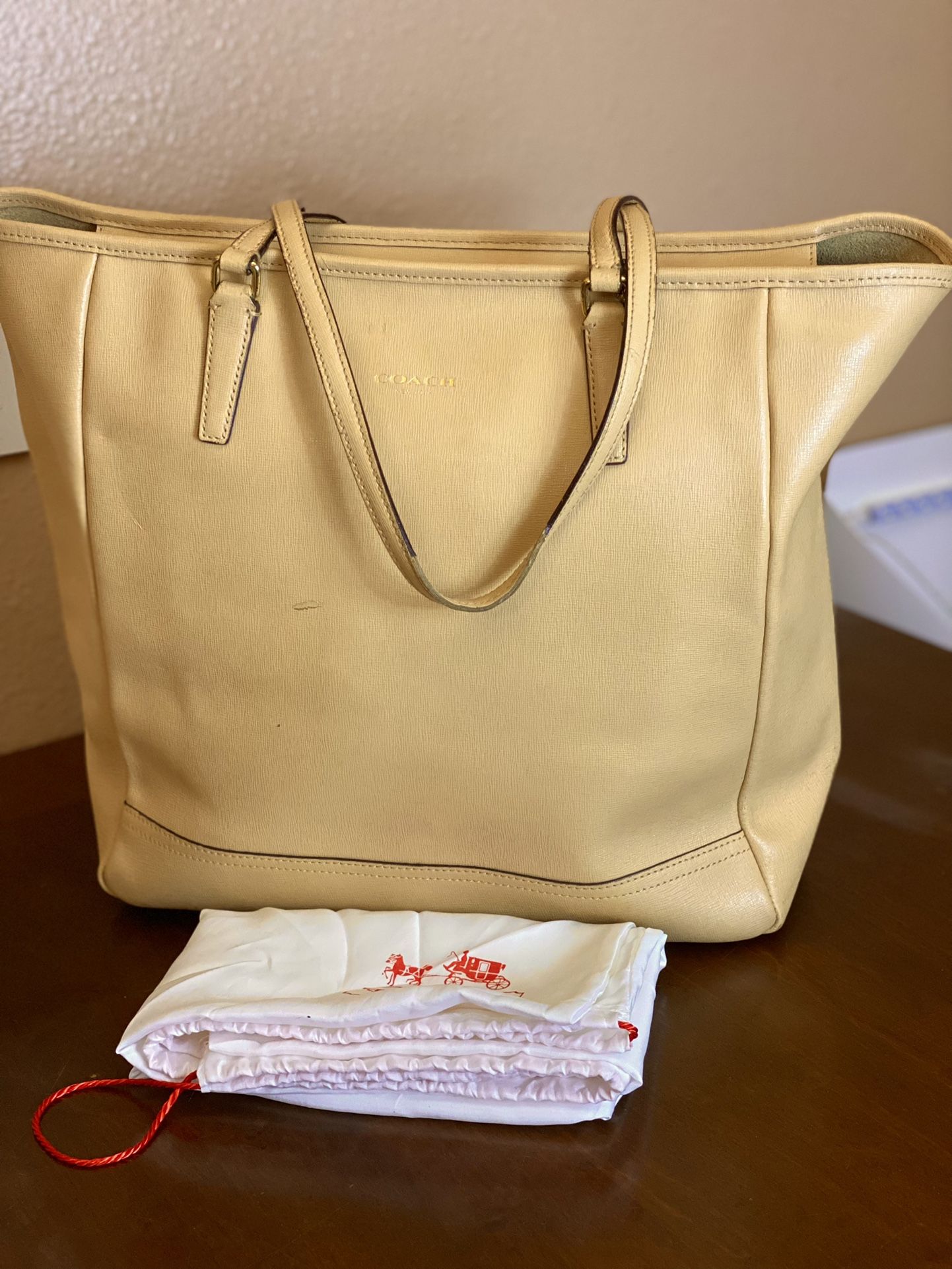 Coach Beige Saffiano NorthSouth City Leather Tote # 23821 PreLoved kept in excellent clean conditions. Reflects minor marks and scuffs as shown in photos. Measurements: 14”L x 6”W x 13”H Double handle 9”L Materials: Saffiano Leather Leather Lining Gold tone hangtag Zipper closure (1) zipper wall pocket (2) slip pockets (1) Dust Bag Included Retails:$495 Questions are welcomed. Thank you for stopping by again.