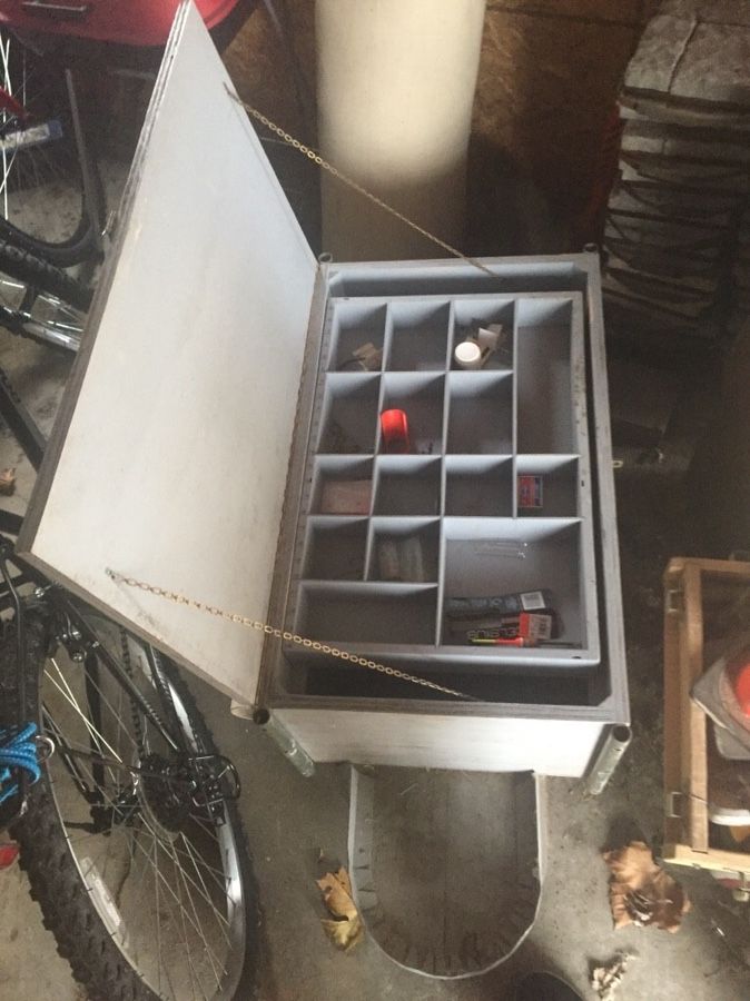 Very cool ice fishing tackle box. Has metal sled on bottom to pull across ice.