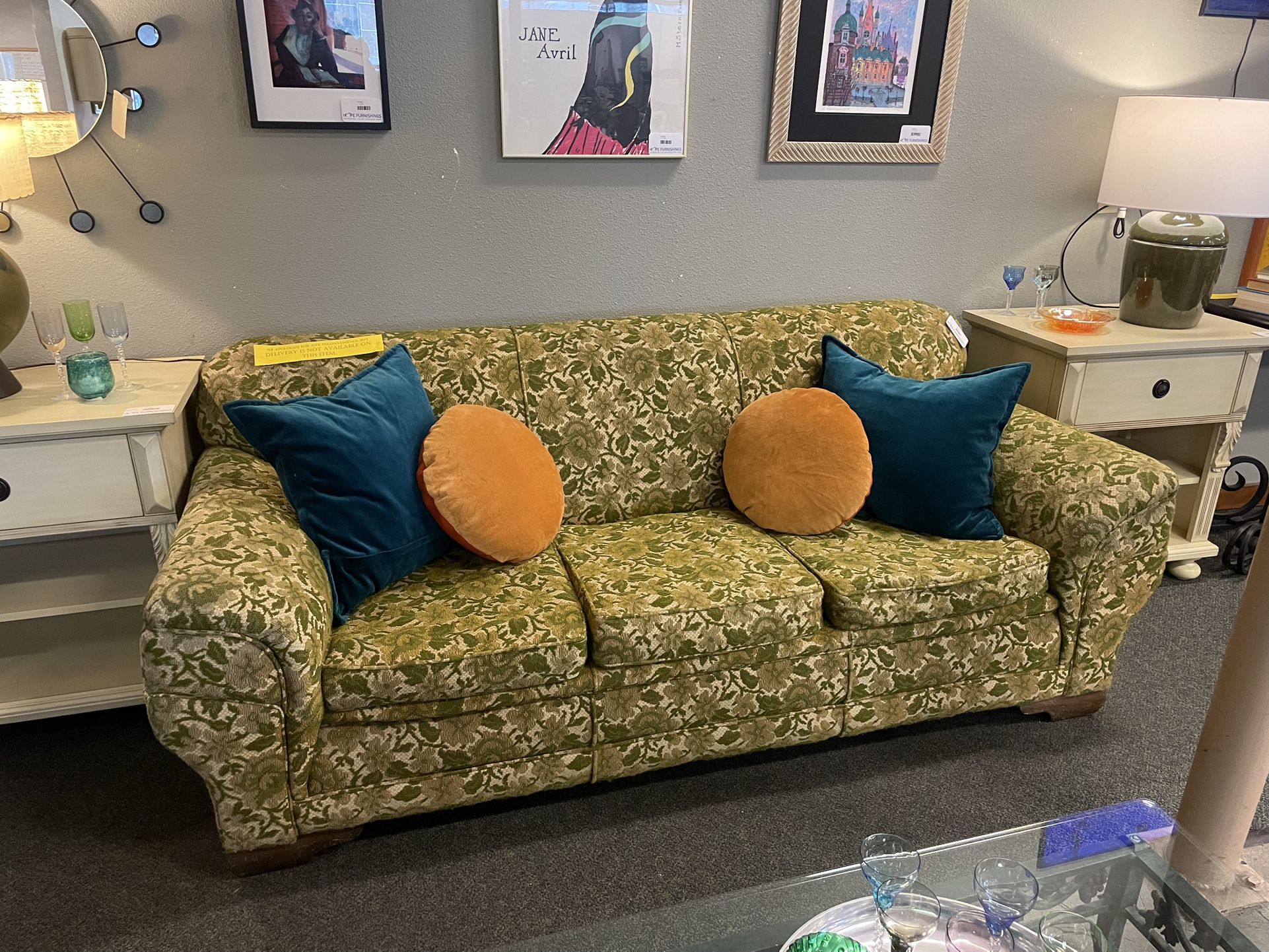 Cool vintage sofa. Check out those arms? It’s so fun to add color into your home and floral prints are en vogue for 2026! The seat covers are removable too. Fabric is in good condition. Because of the weight of this sofa, we cannot offer delivery. It must be self-delivered. Hope Furnishings is the retail program of NW Furniture Bank. We are a nonprofit organization and all of the proceeds from the store are used to help us provide furniture and other necessary household items to local families and individuals in need. All sales are final, so we recommend that you visit our store to view any items that you wish to purchase in person. This print makes you want to macrame