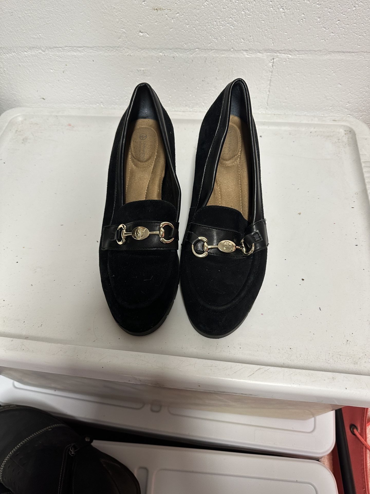 Worn a few times, no flaws, smoke-free home Black loafer-style pumps with gold buckles, cushioned inner soles Women’s size 9.5, regular width