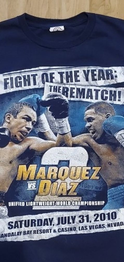 A Vintage boxing t-shirt from the July 2010 rematch of the Fight of the Year between Juan Manuel Márquez and Juan Diaz (Feb. 2009) Marquez went to Diaz's hometown of Houston, TX to face him at the Toyota Center on July 31, 2010. This all-out slugfest ended with Marquez achieving a ninth-round knockout on Diaz. Prime vintage in it's age and rarity. Open to offers. Kept immaculately clean and highly cared for.