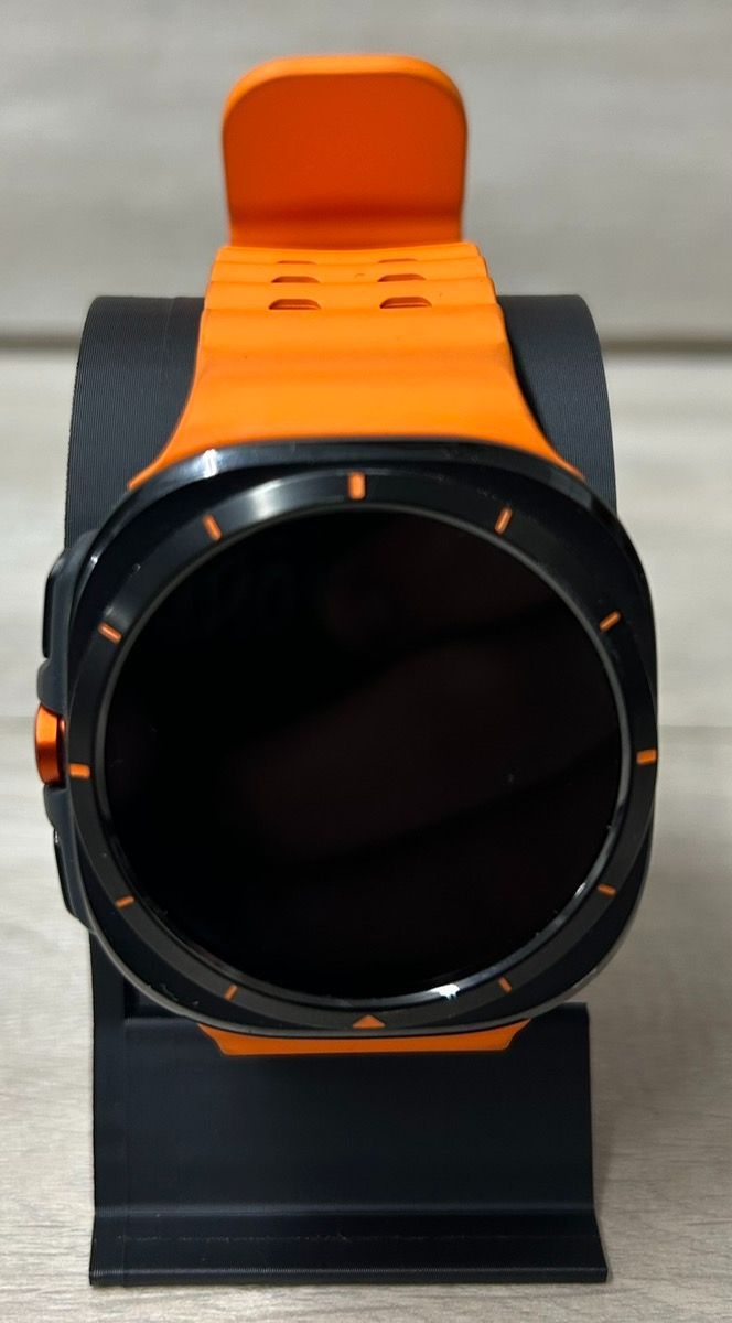 The Samsung Galaxy Watch Ultra is Samsung’s rugged flagship smartwatch designed for outdoor durability, advanced health tracking, and standalone connectivity. The SM-L705U variant is the LTE cellular model intended for the United States market, allowing the watch to make calls, send texts, and receive notifications without needing a phone nearby when activated on a compatible carrier plan. The watch features a 47mm aerospace-grade titanium case paired with a sapphire crystal display designed to withstand harsh outdoor conditions. Its large Super AMOLED display provides excellent brightness and visibility outdoors while maintaining energy efficiency. The watch is built for durability with high water resistance and rugged construction suited for hiking, running, swimming, and other extreme activities. Health and fitness tracking features include heart rate monitoring, sleep tracking, blood oxygen monitoring, stress tracking, and multi-sport workout modes. Built-in GPS allows accurate tracking of outdoor activities without needing a connected phone. The device also includes Bluetooth and Wi-Fi connectivity for pairing with Android devices and syncing notifications, apps, and fitness data. This unit comes in great condition with an orange band installed and includes the original magnetic Samsung charging cable.