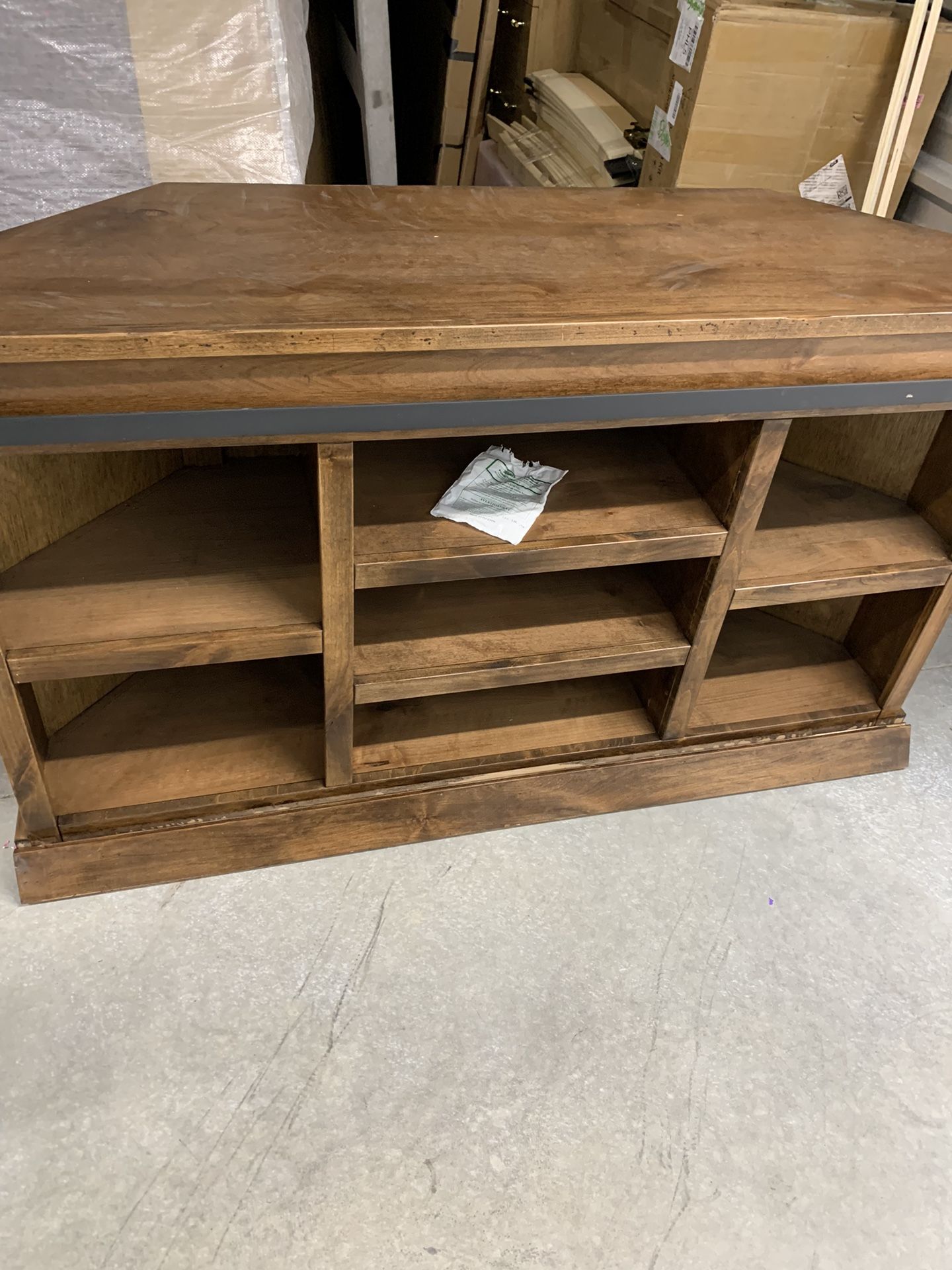 Hungerford 56 Inch Corner TV Stand for TVs up to 60 Inches, No Assembly Required color: Aged Whiskey, New Floor Model missing doors, No doors, see photos