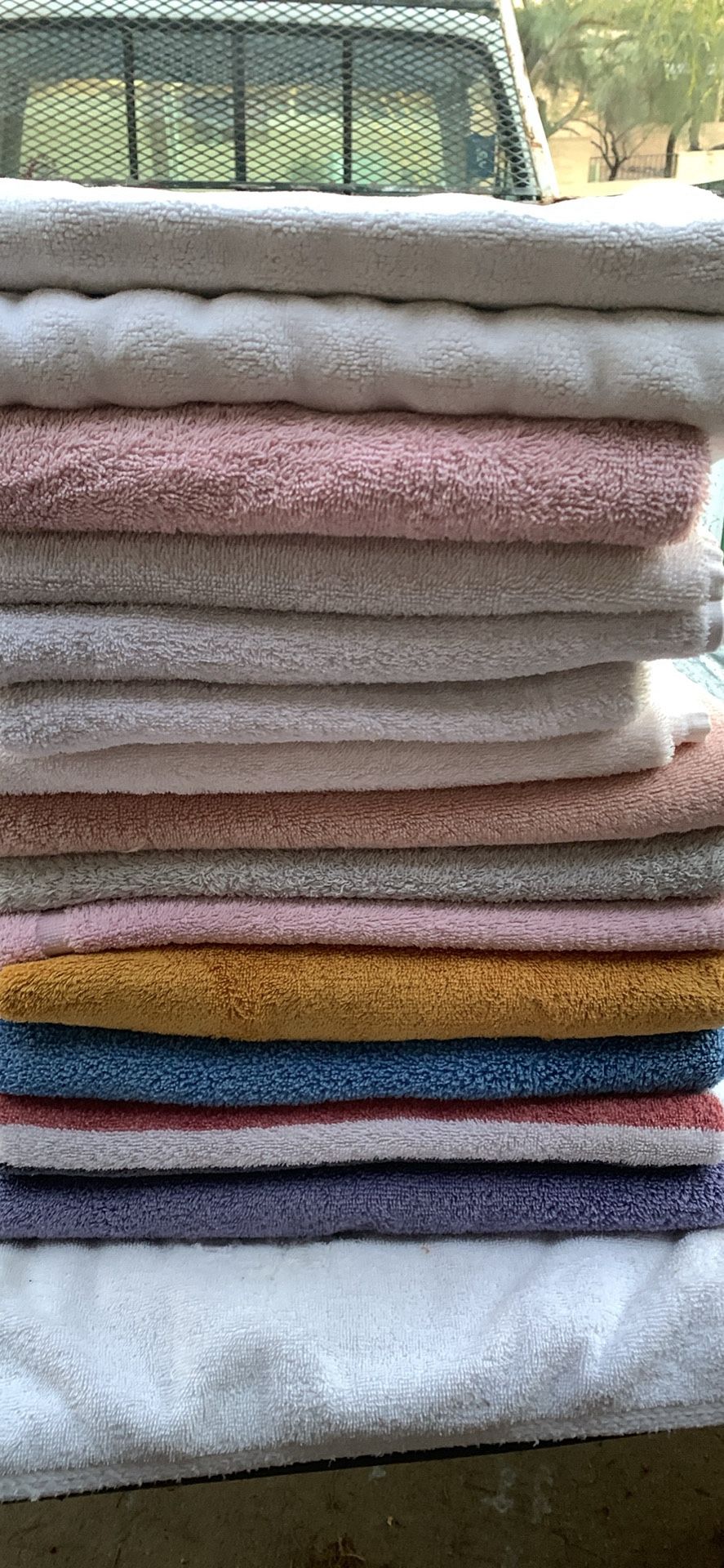14 bath towels in good condition and the top two are bamboo towels. Those are very expensive towels.