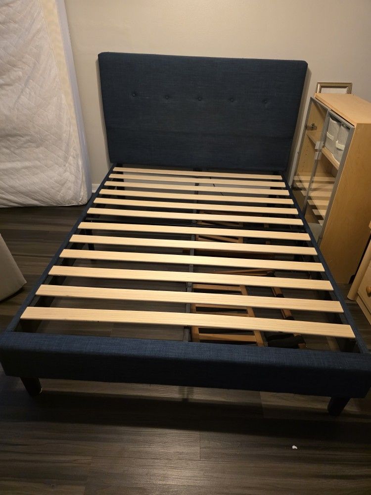 Queen size bed frame, very sturdy and can be packed away in the headboard for easy pick up. Smoke free home! No tears or rips on the fabric, combination of Fabric(Blue-Green), wood slats and metal leg support. Cash only no trades must pick up.