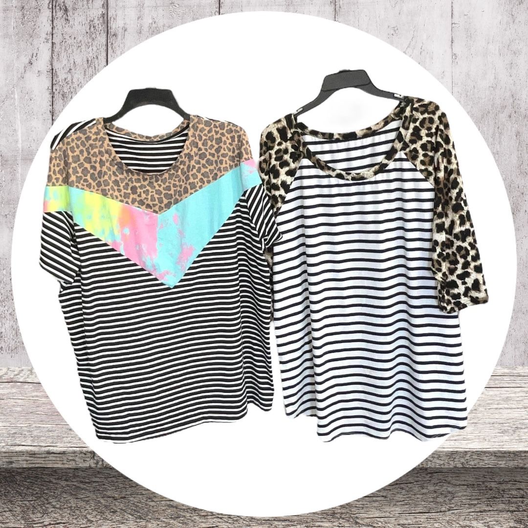 2 Tshirts w Mixed Patterns of Stripes, Leopard, & Camouflage Print Women Size 3X