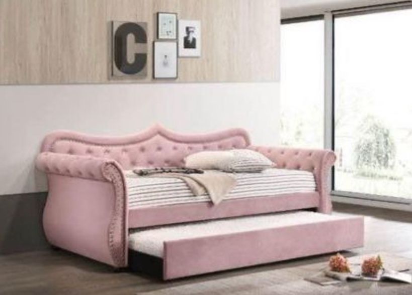 Gorgeous Fully Upholstered Pink Velvet Daybed with Gentle Curves and Sleigh-style Arms Design with pullout Trundle Dimensions: 94"L X 43"W X 42"H Best Prices in the Industry Guaranteed! - ACME (Mattress Not Included) *No Tax *Pickup in Tracy by Appt *We Can Deliver