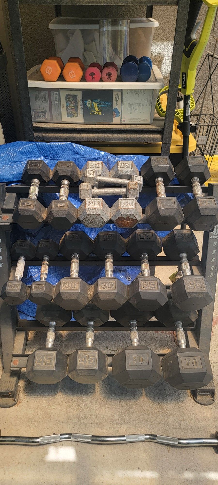 Dumbell set 5lb - 35lbs 45lbs 70lbs Curling bar Olympic bench bar Will not separate dumbells. Comes with rack.
