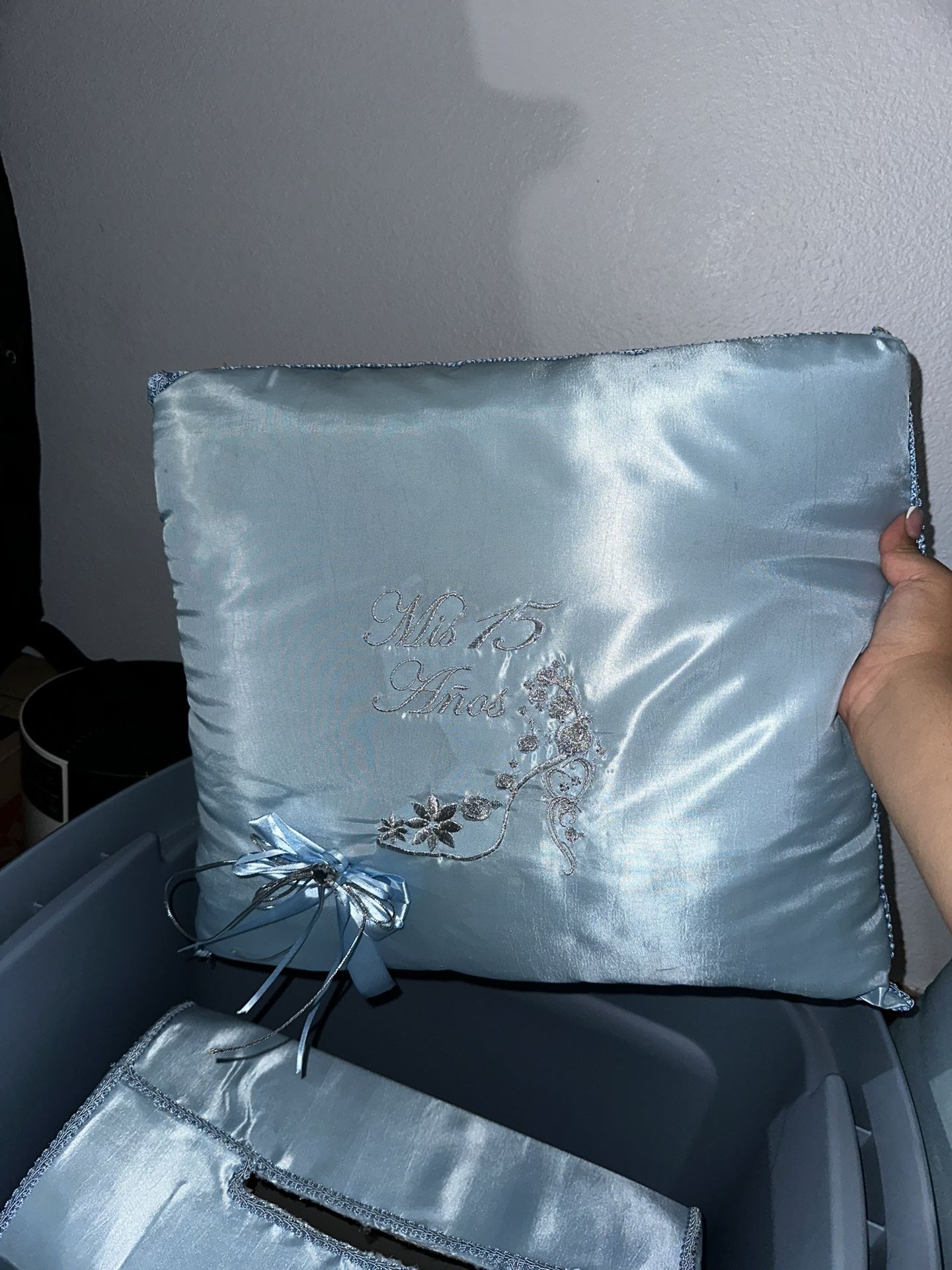 El vestido es L (Large)- Needs to be cleaned Almeuda grande y chica Ramo azul con plateado- the box is folded, but the bouquet is good Caja con fabrico azul-money/letters/gift card cardboard box with fabric Carreta azul con caballo blanco- I put this in a bag so that it wouldn’t get damaged. 15 copas- Needs to be washed Todo solo lo usamos una vez. Está bueno todo sólo que tiene que ser lavado. Sólo acepto Zelle o Venmo.