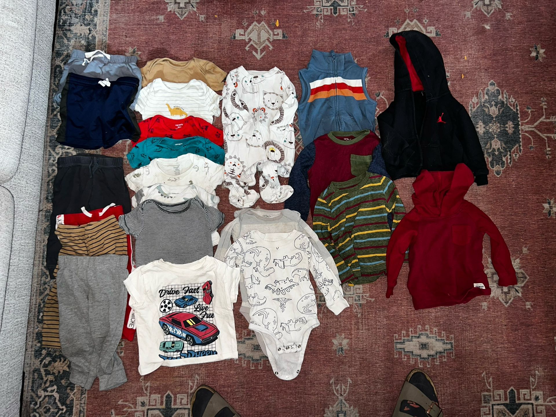 Size nine to twelve months (9-12) baby boy clothes. 1 zip up hoodie, 3 long sleeve shirts, 1 vest, 2 long sleeve onesies, 1 footie pajamas, 7 short sleeve onesies, 1 tee shirt, 2 shorts, 4 pants. ALL 4 BUNDLES (3-18 months) FOR $120 TOTAL!!!