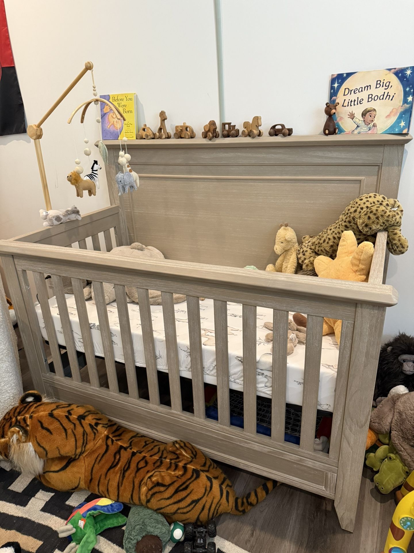 Wooden rustic crib 4 in 1 converts into toddler bed never used pottery barn . restoration hardware Assembled Dimensions: 57.5" x 30.75" x 48" Assembled Weight: 81.4 lbs