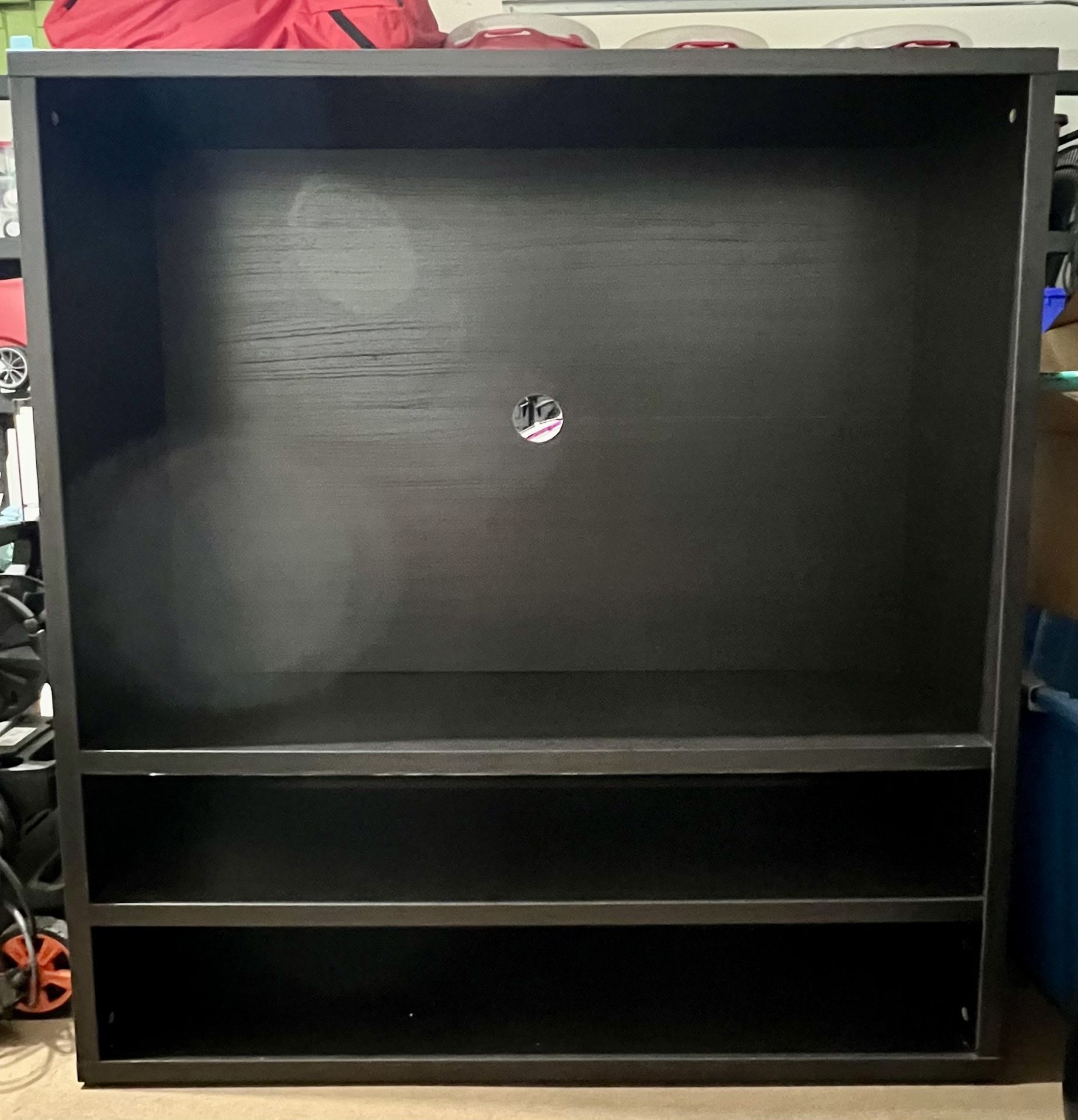 Used, minor wear and tear Dark brown color Ikea Besta line Tv Opening Width 45 inches Tv Opening height 32 inches Tv Diagonal opening 54 inches Tv opening depth 12.5 inches Total stand height 51 inches Total stand width 47.5 inches Includes 2 storage shelves below tv opening *TV not included*
