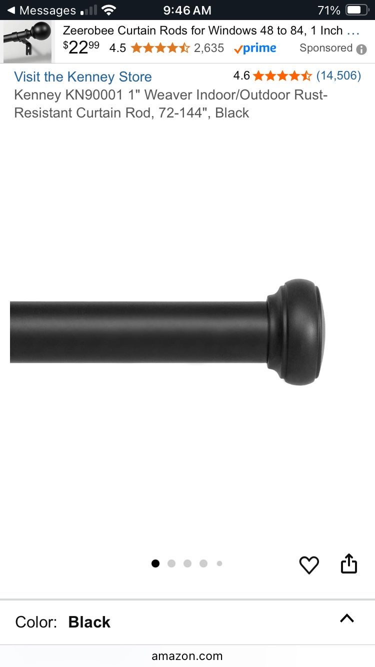 Weaver 1” Indoor/Outdoor Rust-Resistant Curtain Rod Black Crafted from durable coated steel 72”- 144" telescoping rod 2 brackets, can be ceiling or wall mounted Includes curtain rod, two curtain rod brackets, one center support, screws, and drywall anchors (Retail $50) Alternate Amazon Basics brackets included if a full circle bracket is preferred (retail $15)