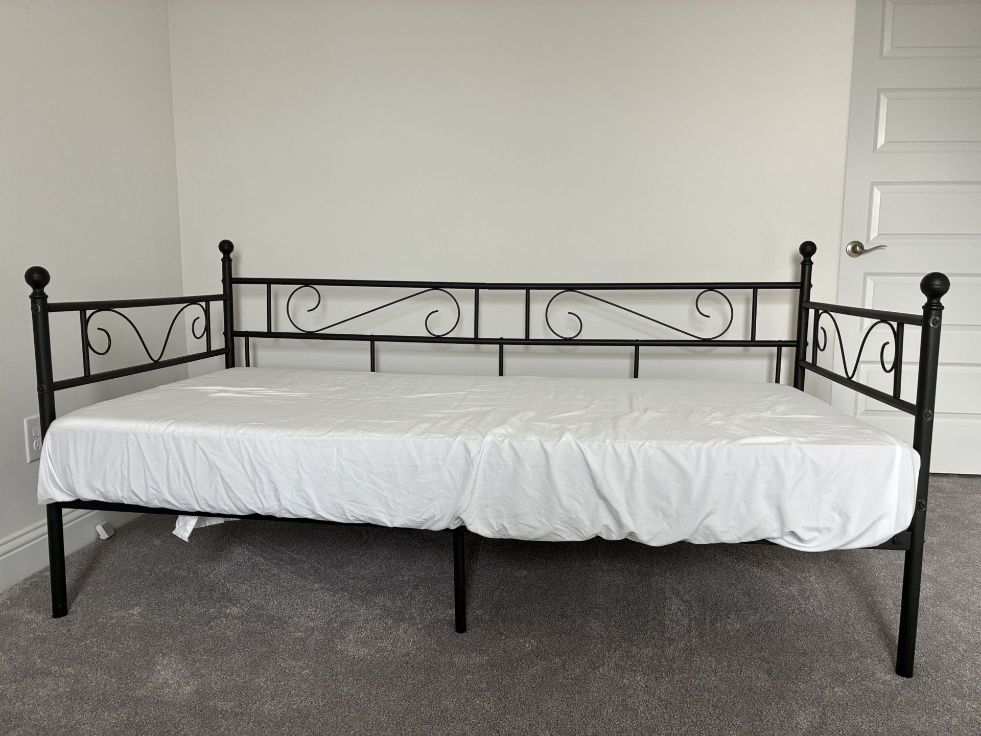 Day Bed Metal Frame, good condition . Asking price $30. Dimensions 77L 37B 37H. Comes with the bed if you want it.