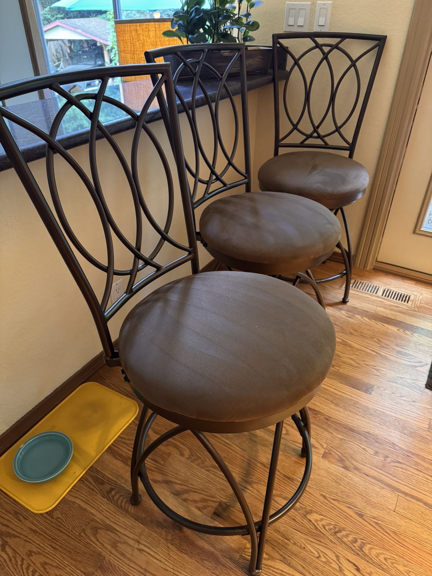 Barely used counter height swivel stools. Metal frame with adjustable feet. Pretty heavy duty. We paid $600 new. Went a different direction style wise.