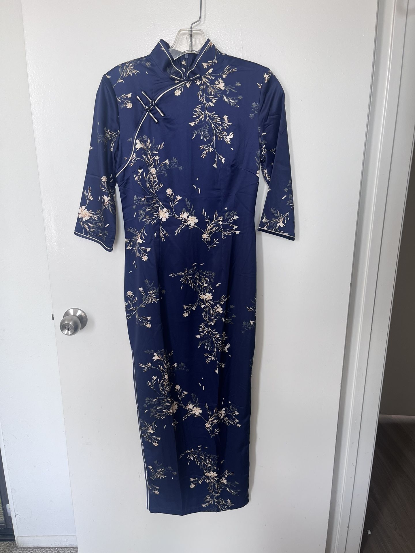 Long silk qipao. Worn once! Slits on both sides Size: women’s US 2 Dress length: 51 inches Shoulder: 14.5 inches Hips: 33 inches Waist: 26.6 inches