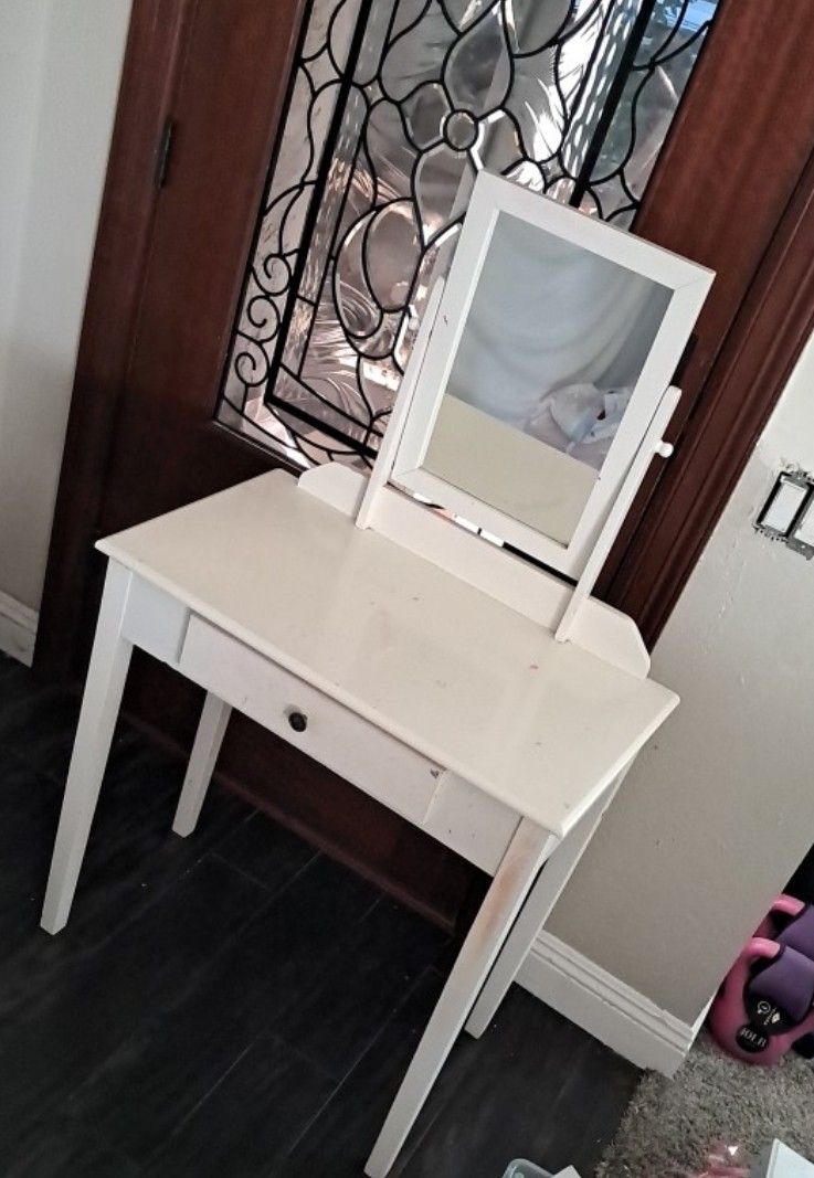 Needs a paint job but other then that nothing wrong. Mirror can move and be adjusted has one drawer and is light wieght