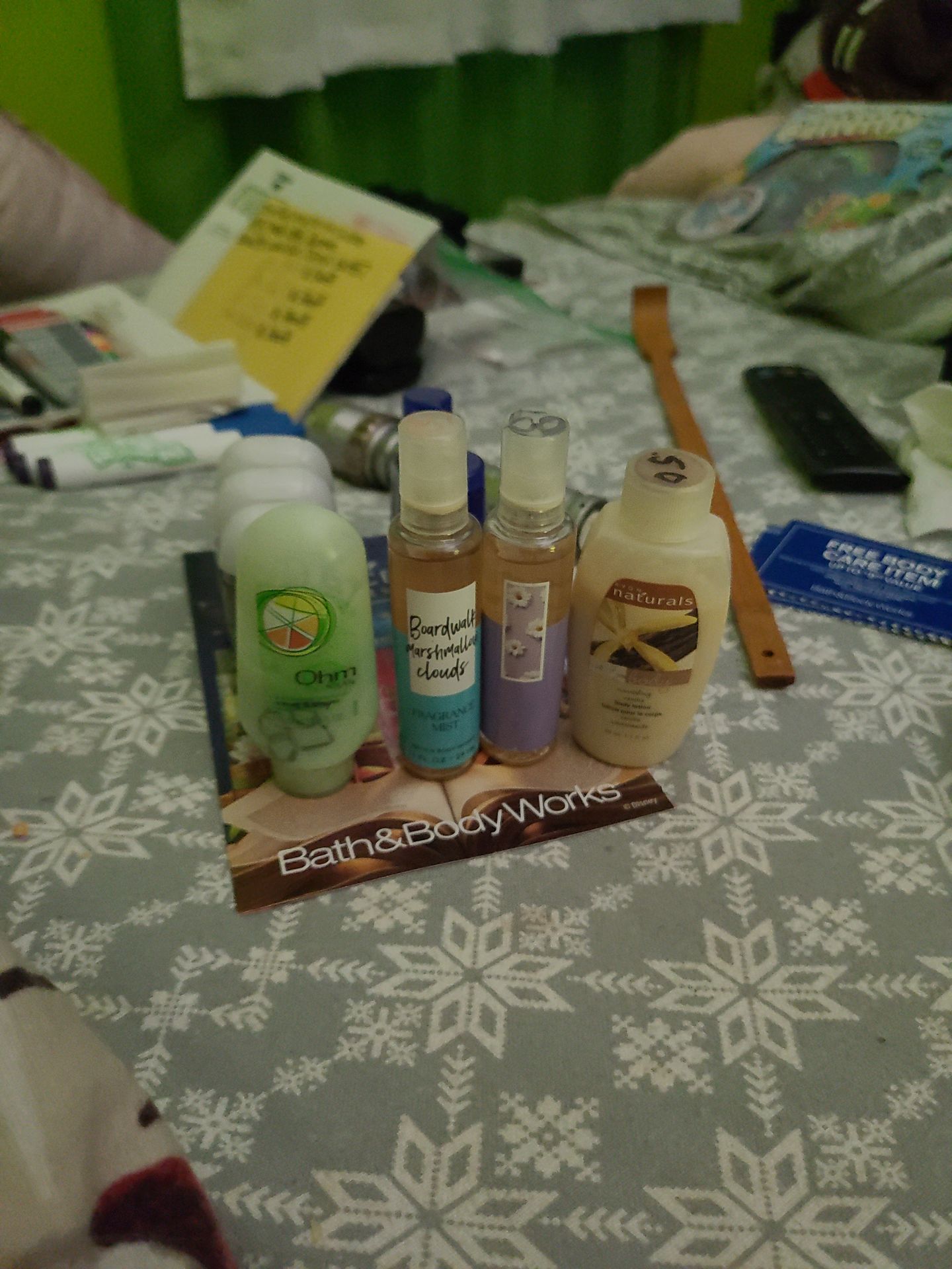 3 small hand gel sanitizers, 3 small hand gel sanitizers blue raspberry, 2 birthday wishes, 1 strawberry kiwi, 1 small olay citrus and ginger body wash, 1 vanilla body lotion, 1 picnic summer daisies fragrance mist, 1 boardwalk marshmallow clouds fragrance mist