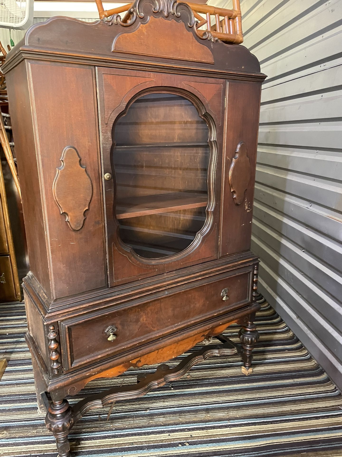 68” tall at highest point 40 wide 16 deep Solid wood excellent quality Non smoker An oldie but goodie 2 shelves inside polish this up and leave as is or do a complete makeover Can deliver small fee