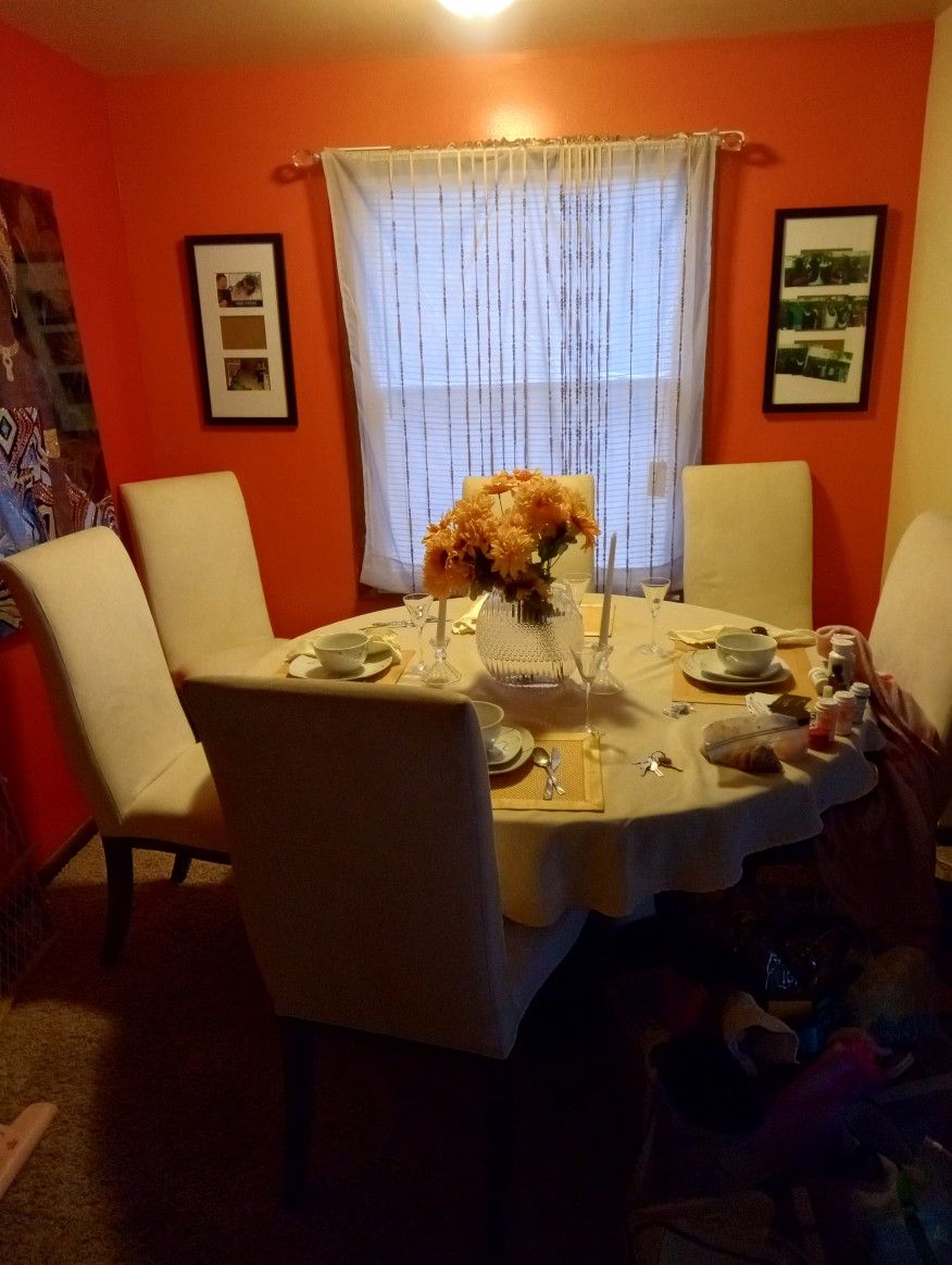 7 piece round table dining table brown very nice 6 white chairs very comfortable
