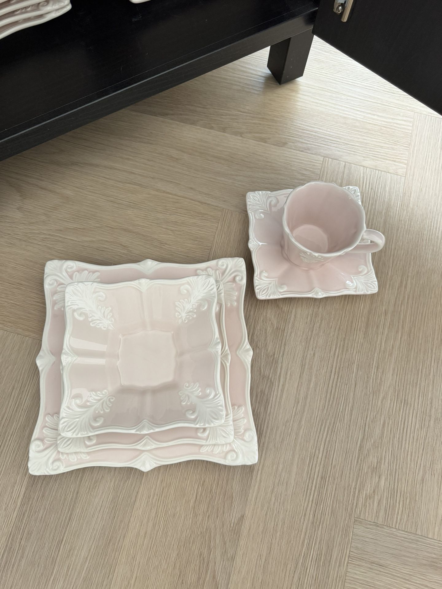 60 piece - Pink Square Baroque Dinnerware Service Exclusively from Horchow Handcrafted of earthenware; light pink and beige color, Cream Embossed Scrolls & Plume Edge Service includes (12) 10.25"Sq. dinner plates (12) 8.25"Sq. salad plates (12) 7"Sq. bowls (12) saucer (12) cups Dishwasher and microwave safe. Made in Portugal. Originally $900 set. Brand new, washed to use, stored, and never used. Pick up in Burbank.