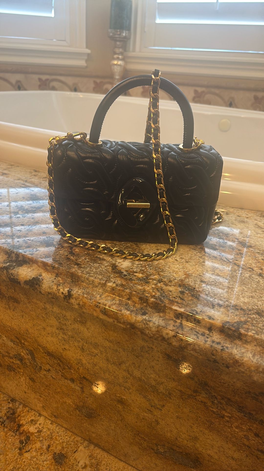 This is a Rebecca Minkoff Top Handle Chain Quilt Leather Crossbody bag in black leather with gold Hardware