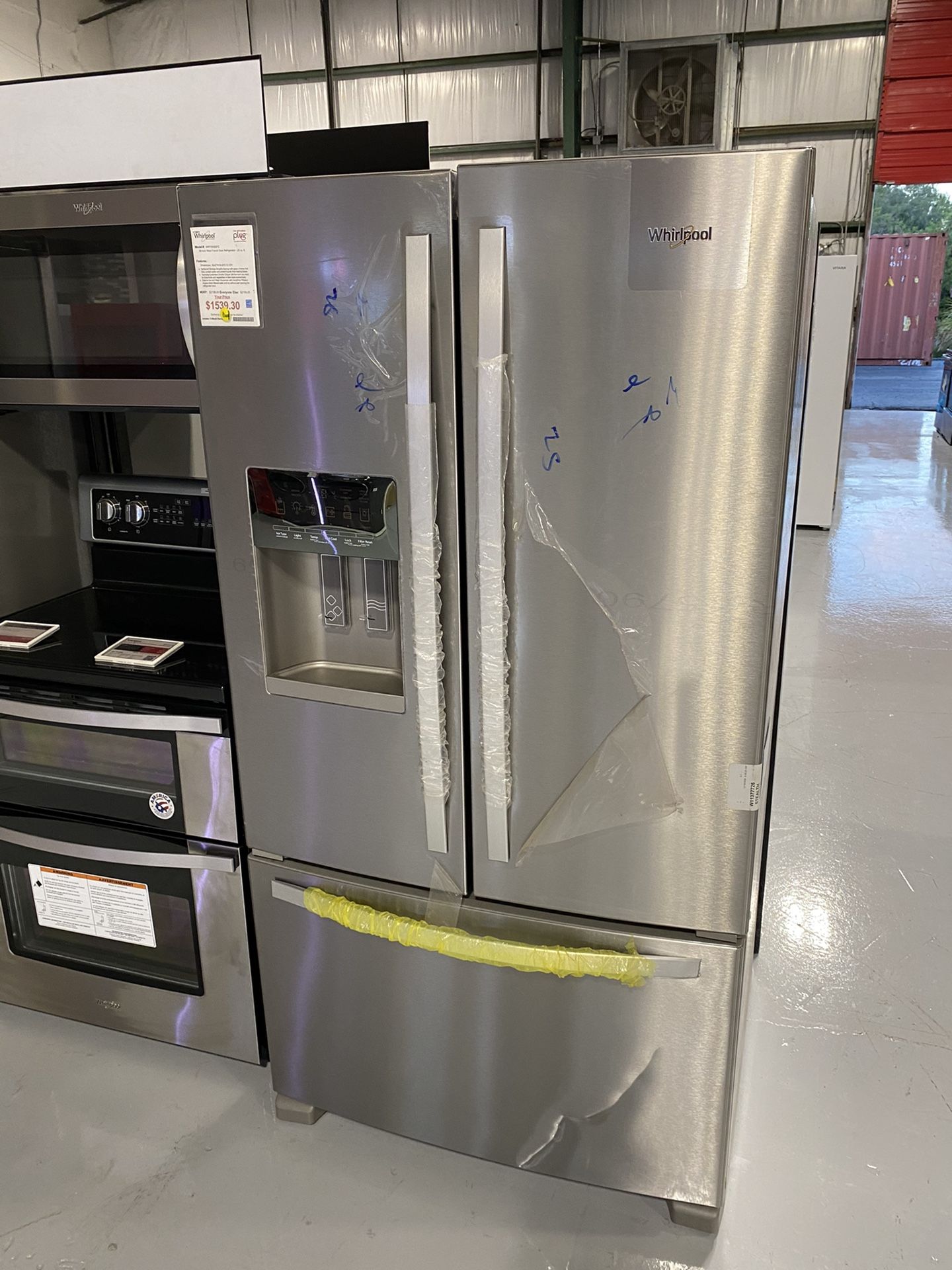 New Open Box Whirlpool Stainless Steel 36” Wide French Door Refrigerator - 25 Cu. Ft. Model #WRF555SDFZ Dimensions: 35.62”W 35.25”D 70.12”H SpillProof Shelves: simplify cleanup with glass shelves that help contain spills and prevent liquids from leaking below. Humidity Controlled Double Crisper: get the room you need to store fruits and vegetables in their ideal environment. Exterior ice and water dispenser with EveryDrop Filtration: access fresh filtered water and ice without ever opening the refrigerator door. Includes a 12-month warranty Financing Available Delivery and installation available Contact us with any questions or to stop by to see this unit and others. Open Monday - Saturday 10am - 6pm Our inventory changes daily. Message us for availability.