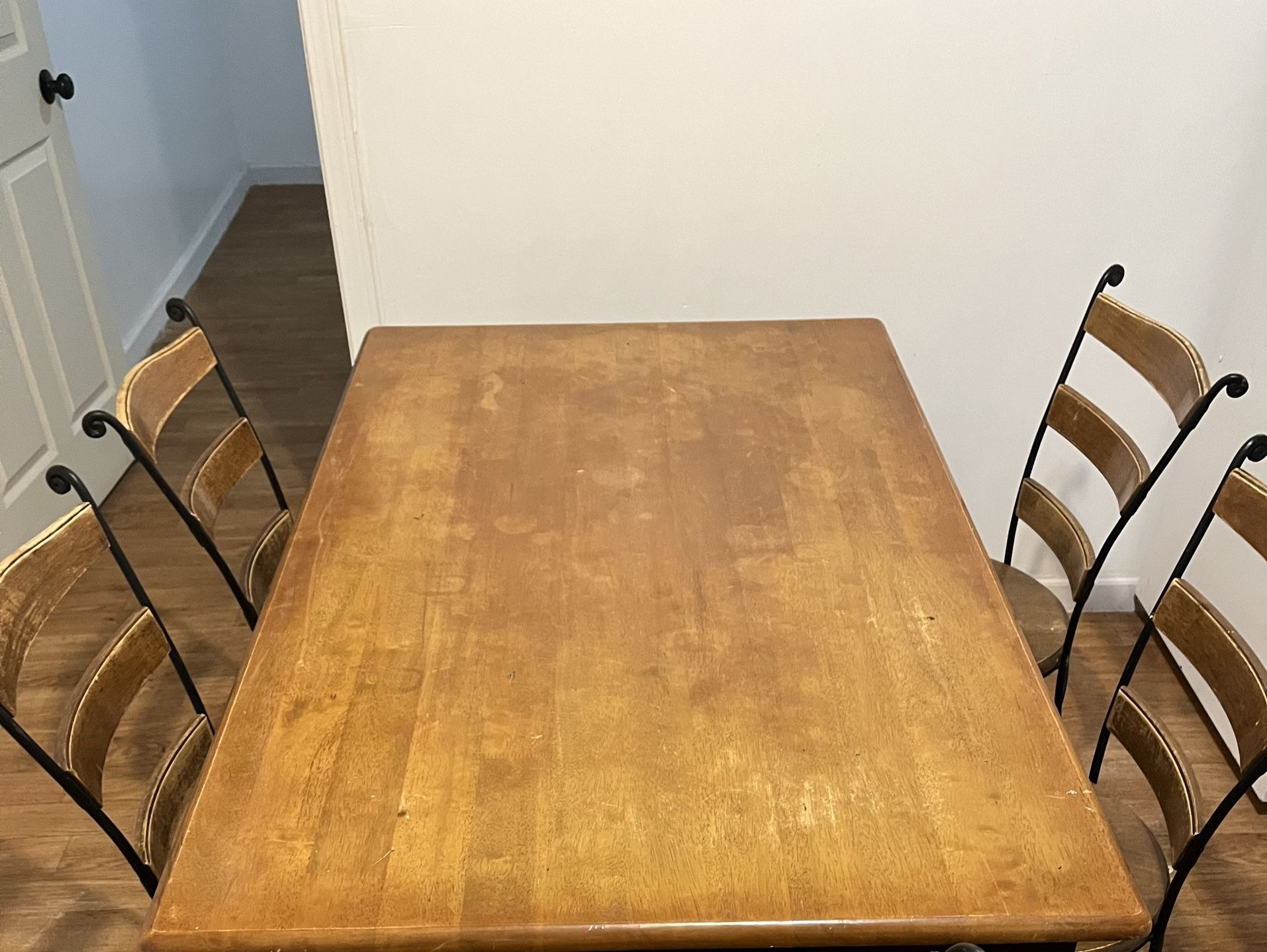 Solid wood table and chairs. The frame of chairs was handcrafted and made of forged wrought iron.