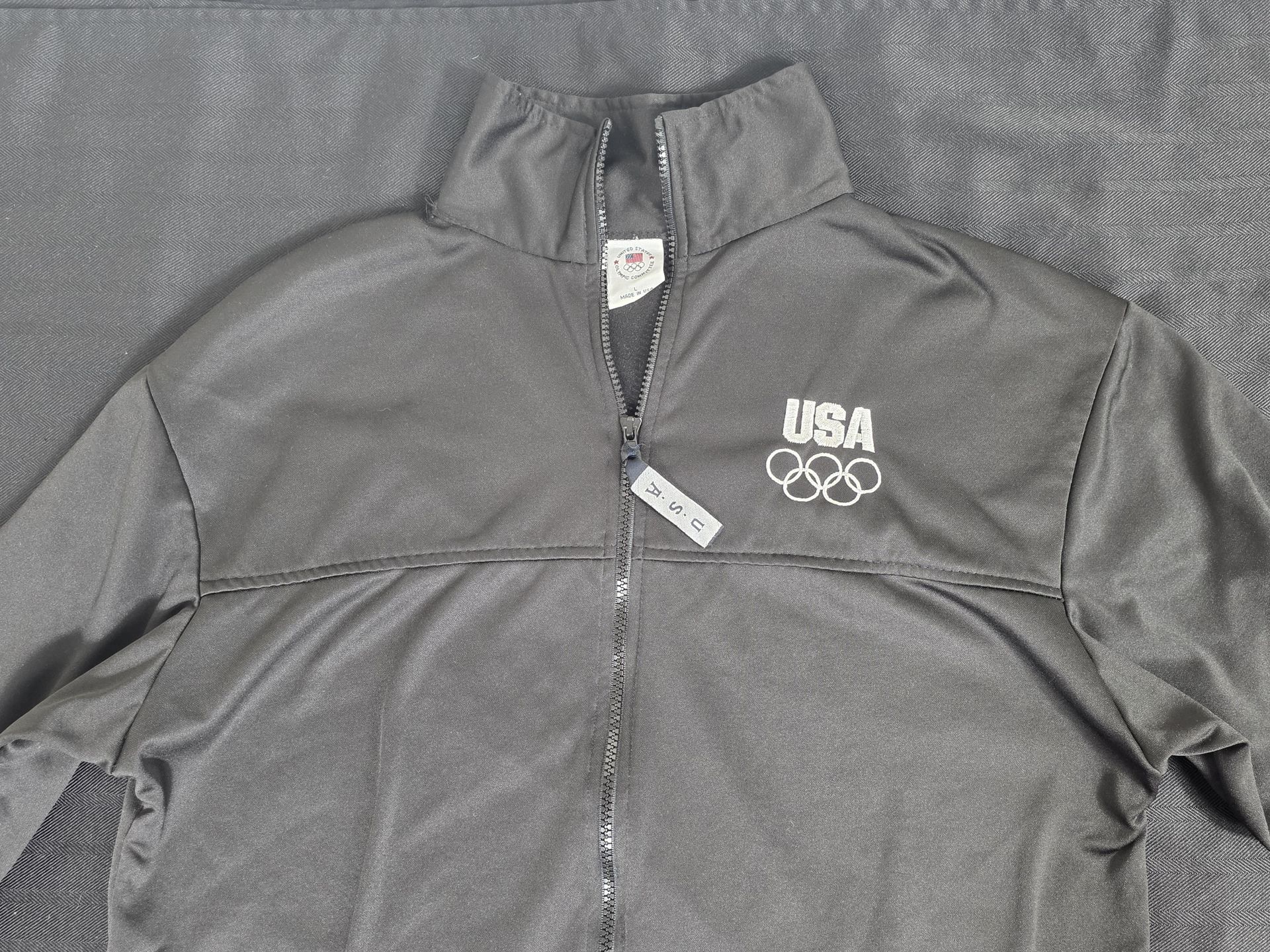 United States Olympic Committee zip-up lightweight warmup/training jacket. Great condition. Tag size large, fits like mens medium or women's large. Made in USA! Black with white embroidered USA and Olympic rings. Likely vintage 1990s?