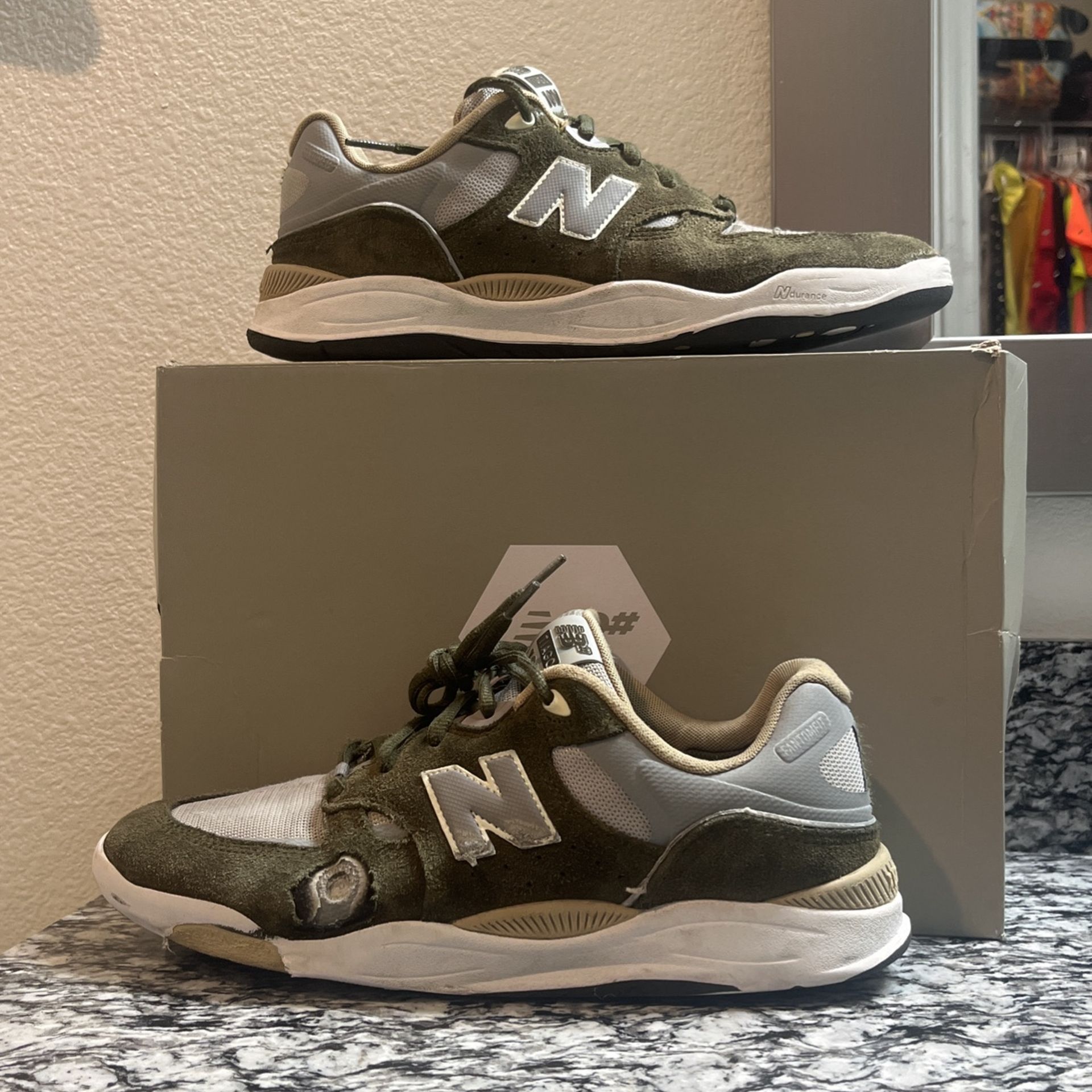Tiago lemos 1010 olive green color way size 10 been skated a bunch in these shoes but the shoes still have life. The shoes features impact protection when your jumping big sets you won’t feel it as much.