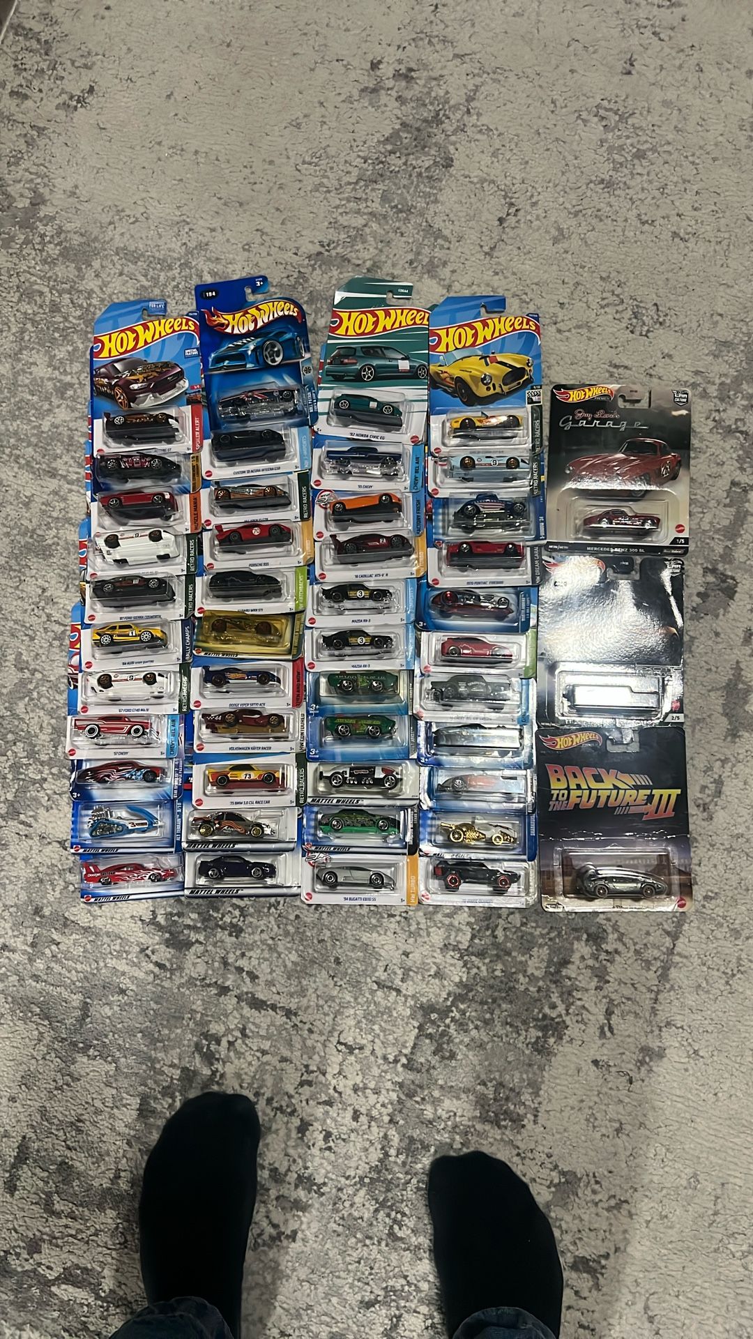 A massive lot of Hot Wheels diecast cars, perfect for the serious collector, aspiring enthusiast, or as a bulk gift. This collection features a mix of cars, most of which are carded and in mint condition (please see photos for exact condition of cards).